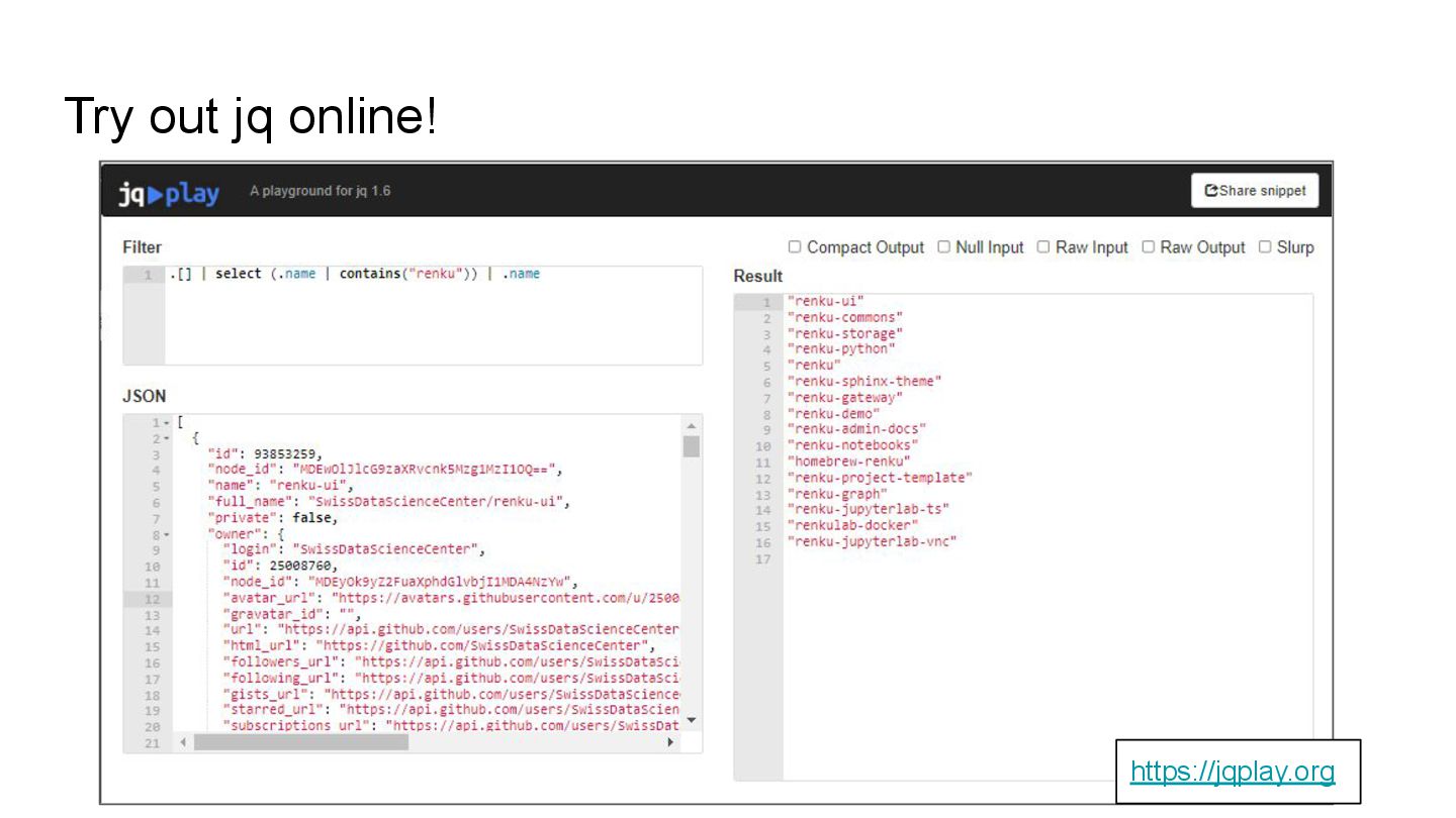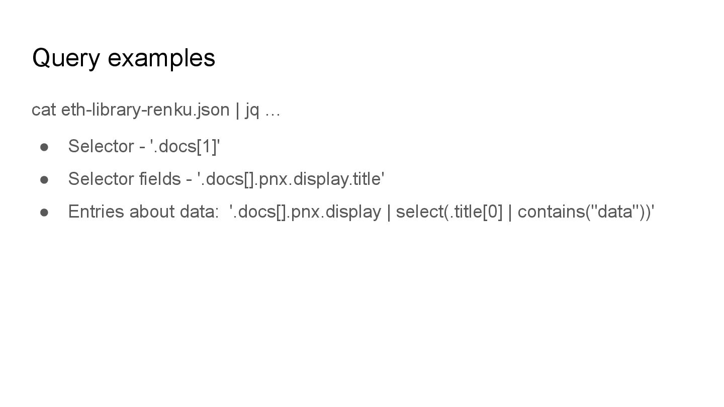 Quick introduction to jq and yq for data science first-year students. In the presentation, we review the key capabilities of the tools and do a quick demo for using them with real data from the ETH Zurich library registry.
