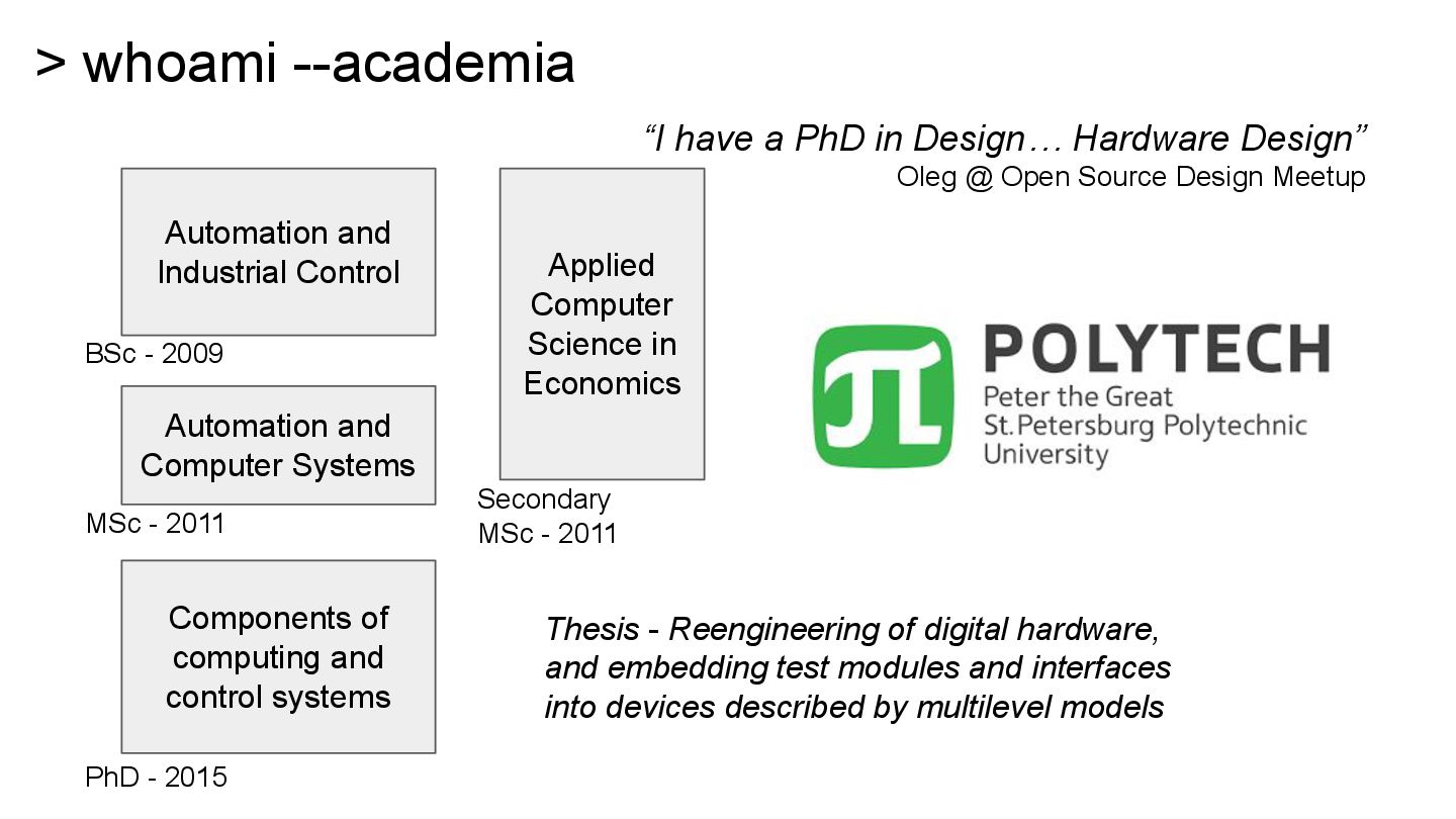 Design” Oleg @ Open Source Design Meetup Automation and Industrial Control Automation and Computer Systems Components of computing and control systems Thesis - Reengineering of digital hardware, and embedding test modules and interfaces into devices described by multilevel models BSc - 2009 MSc - 2011 PhD - 2015 Applied Computer Science in Economics Secondary MSc - 2011