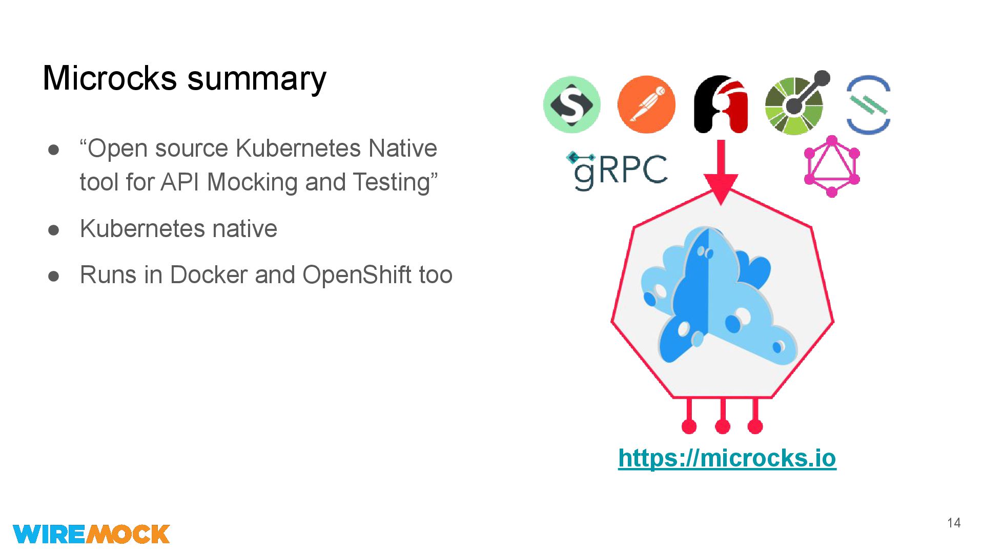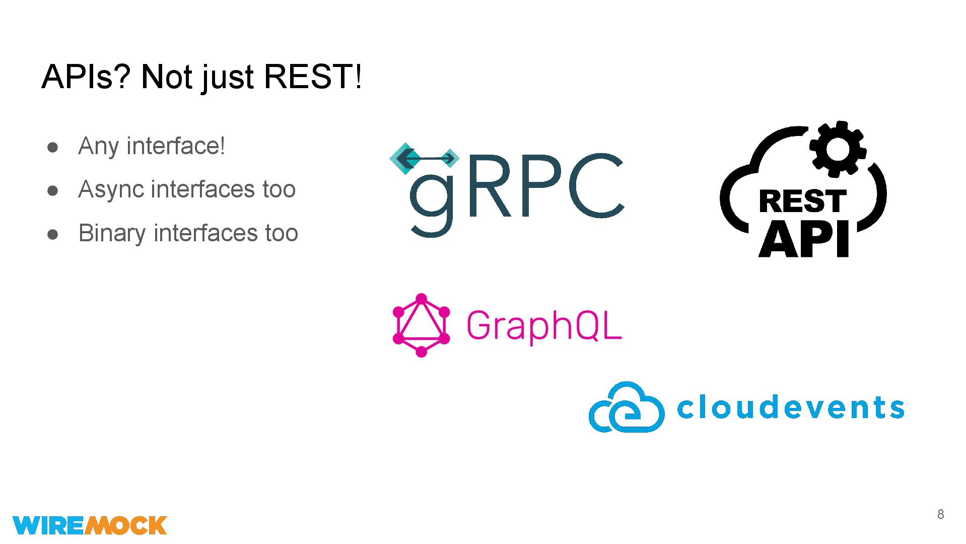 API * Yes Yes HTTPs / SSL Yes Yes gRPC Adapter Yes GraphQL Yes (extension) Yes Async API Adapter => AWS SNS/SQS, Kafka, RabbitMQ, NATS, PubSub, MQTT No Yes CloudEvents PoC Yes (blog) Websockets No Yes * WireMock is more powerful for HTTP(s), but less - for gRPC