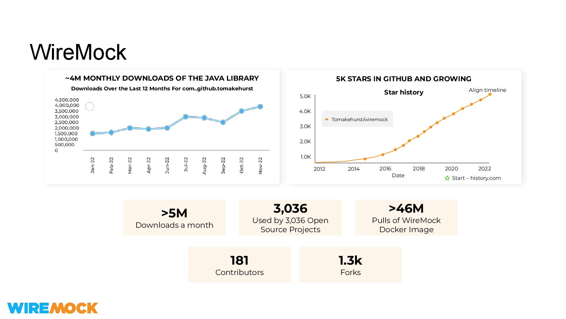 Last 12 Months For com..github.tomakehurst WireMock 5K STARS IN GITHUB AND GROWING 4.0K 3.0K 2.0K 1.0K 2012 2014 2016 Date 2018 2020 2022 Star history Align timeline Start – history.com Tomakehurst/wiremock 5.0K 3,036 Used by 3,036 Open Source Projects >46M Pulls of WireMock Docker Image 181 Contributors >5M Downloads a month 1.3k Forks