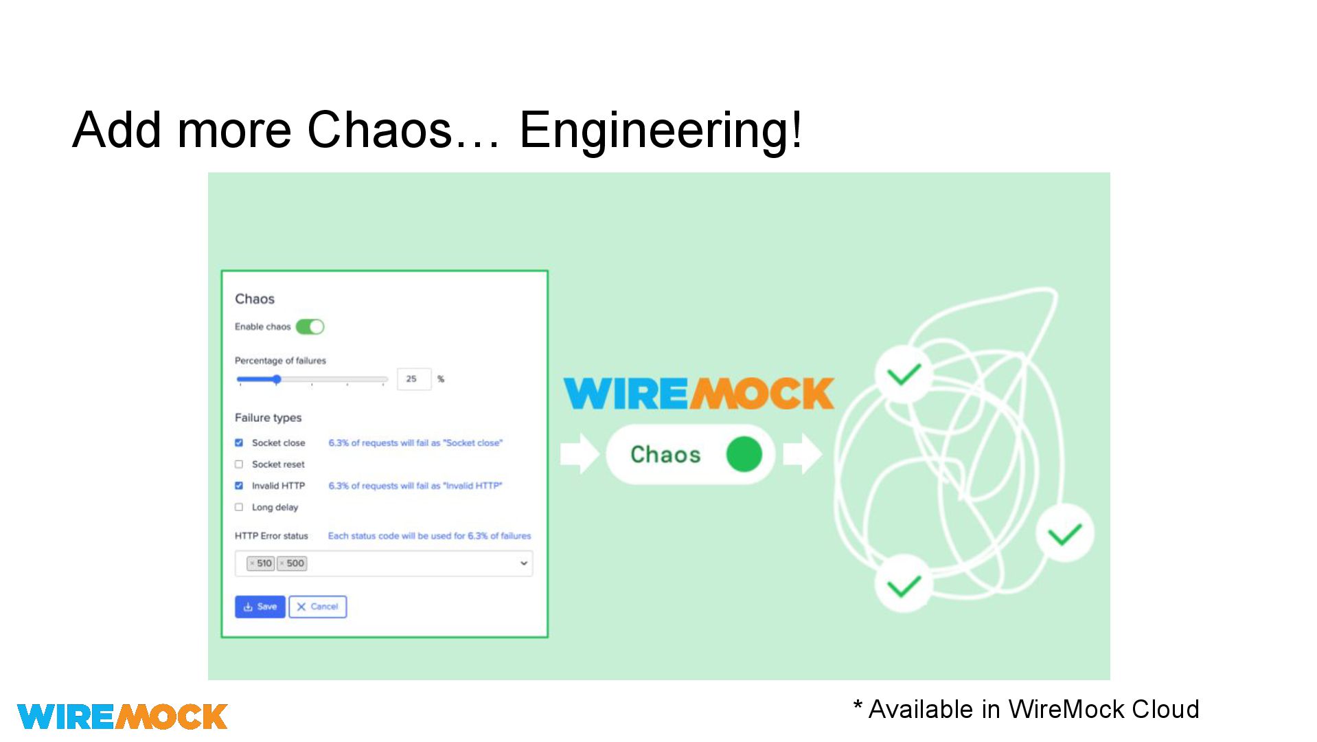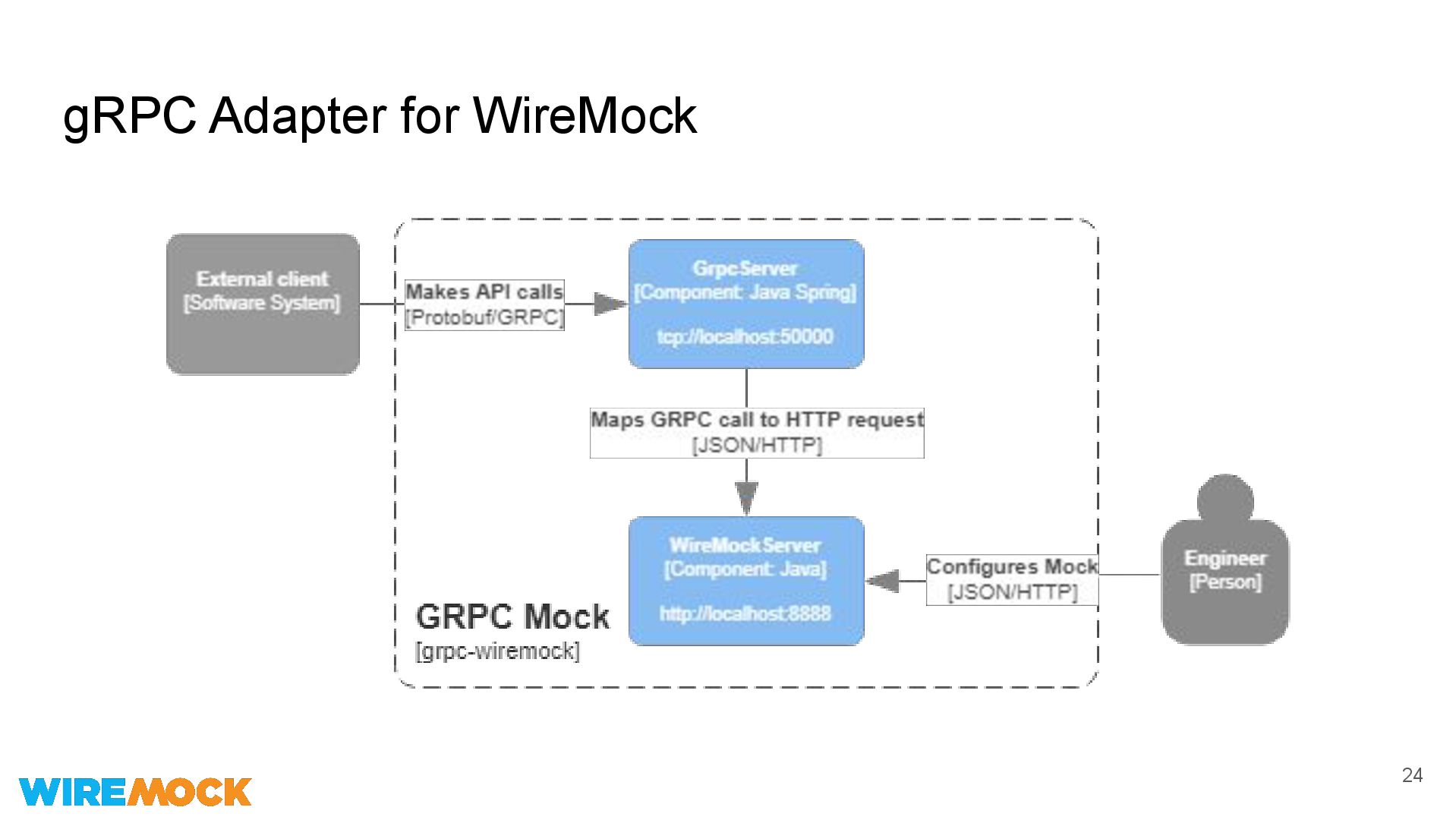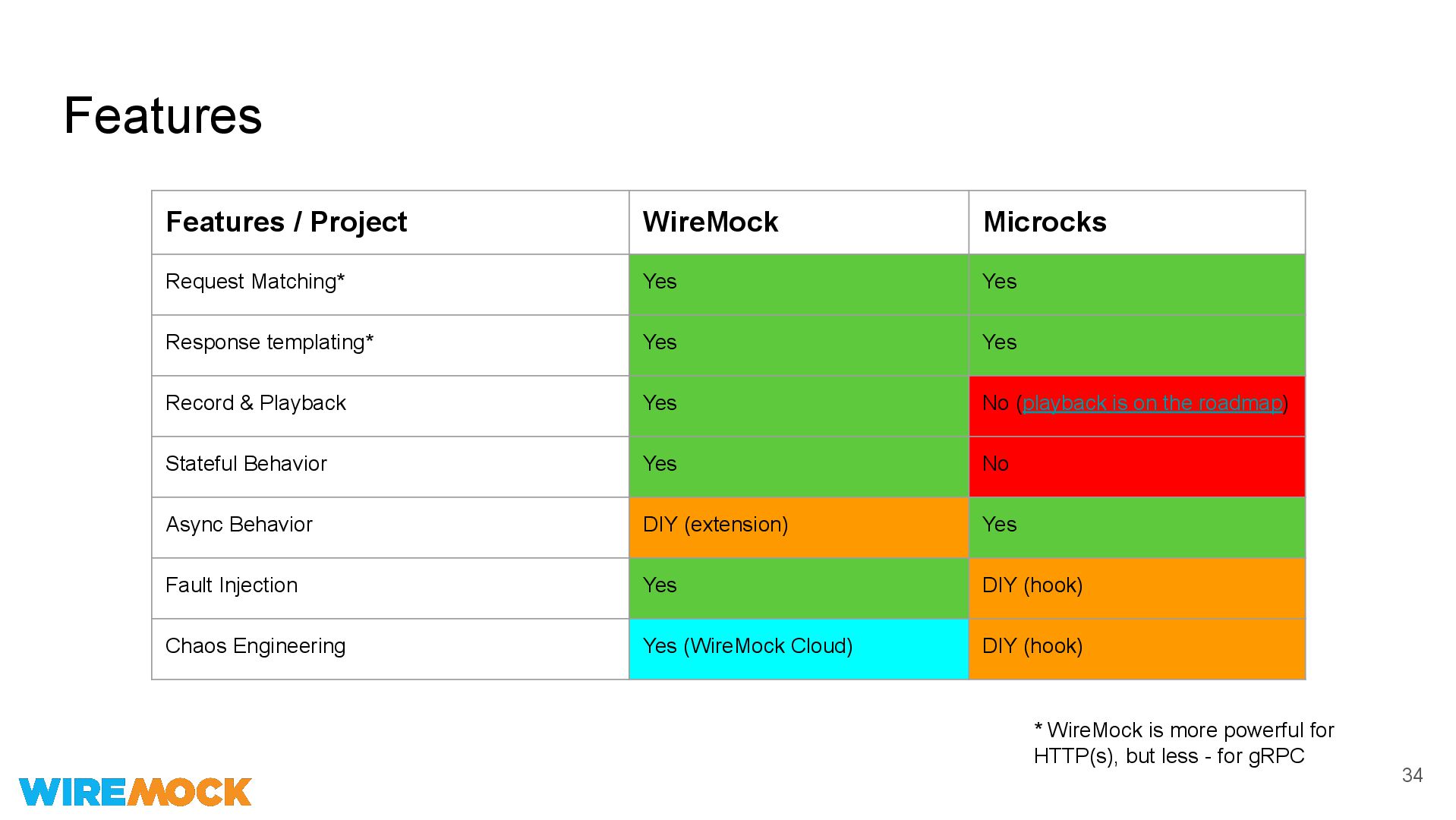 Yes Response templating* Yes Yes Record & Playback Yes No (playback is on the roadmap) Stateful Behavior Yes No Async Behavior DIY (extension) Yes Fault Injection Yes DIY (hook) Chaos Engineering Yes (WireMock Cloud) DIY (hook) * WireMock is more powerful for HTTP(s), but less - for gRPC