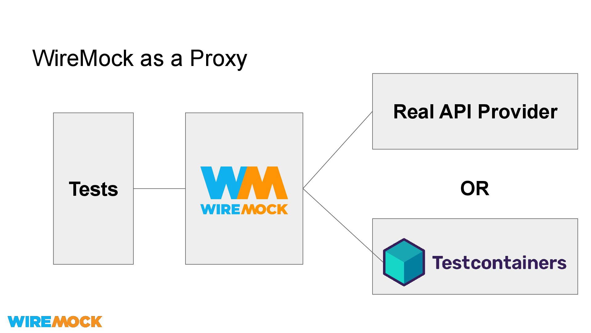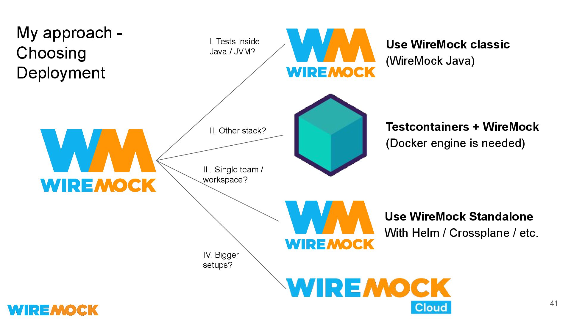 - Choosing Deployment I. Tests inside Java / JVM? II. Other stack? Use WireMock classic (WireMock Java) III. Single team / workspace? IV. Bigger setups? Use WireMock Standalone With Helm / Crossplane / etc.