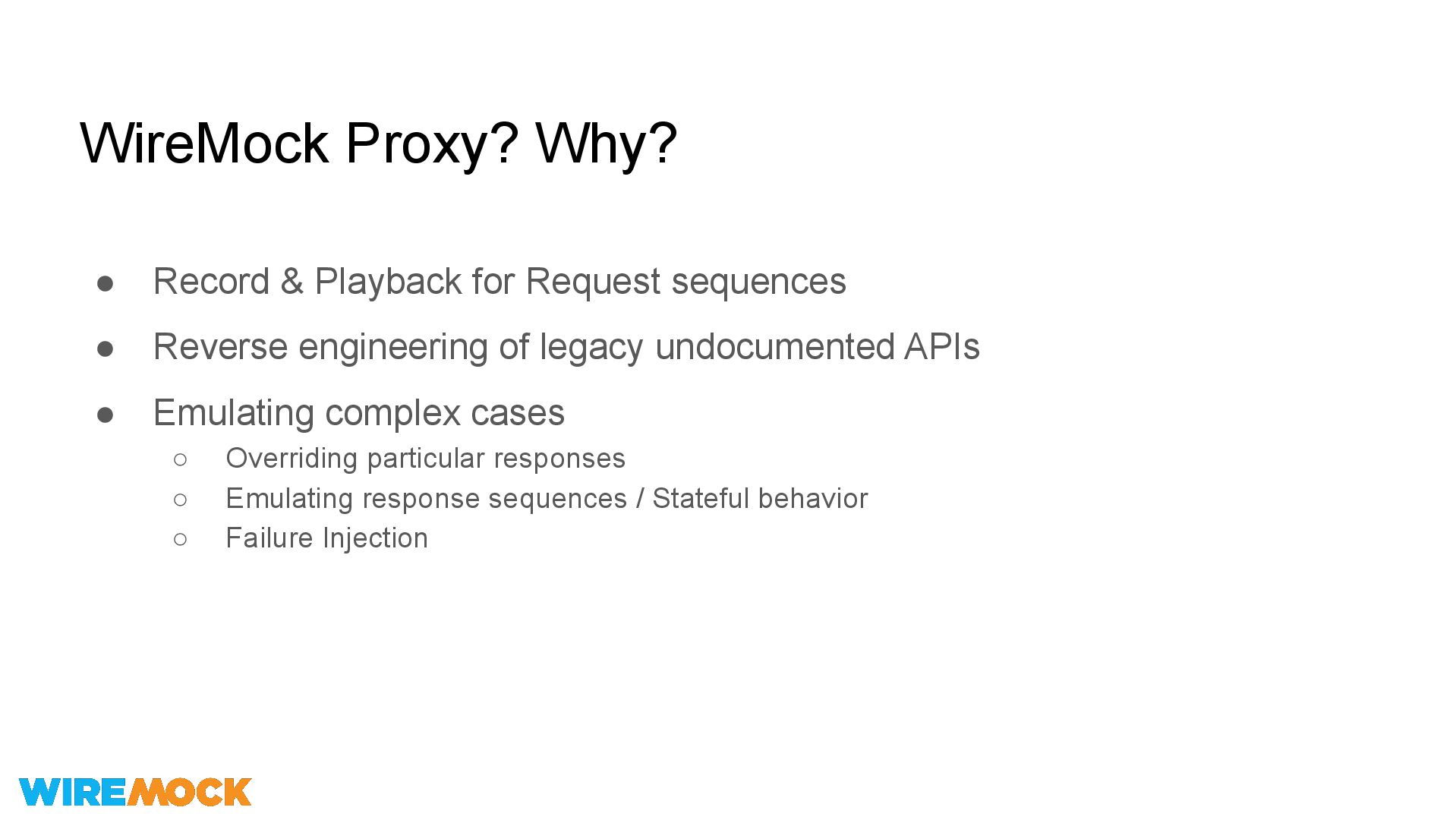 • Reverse engineering of legacy undocumented APIs • Emulating complex cases ◦ Overriding particular responses ◦ Emulating response sequences / Stateful behavior ◦ Failure Injection
