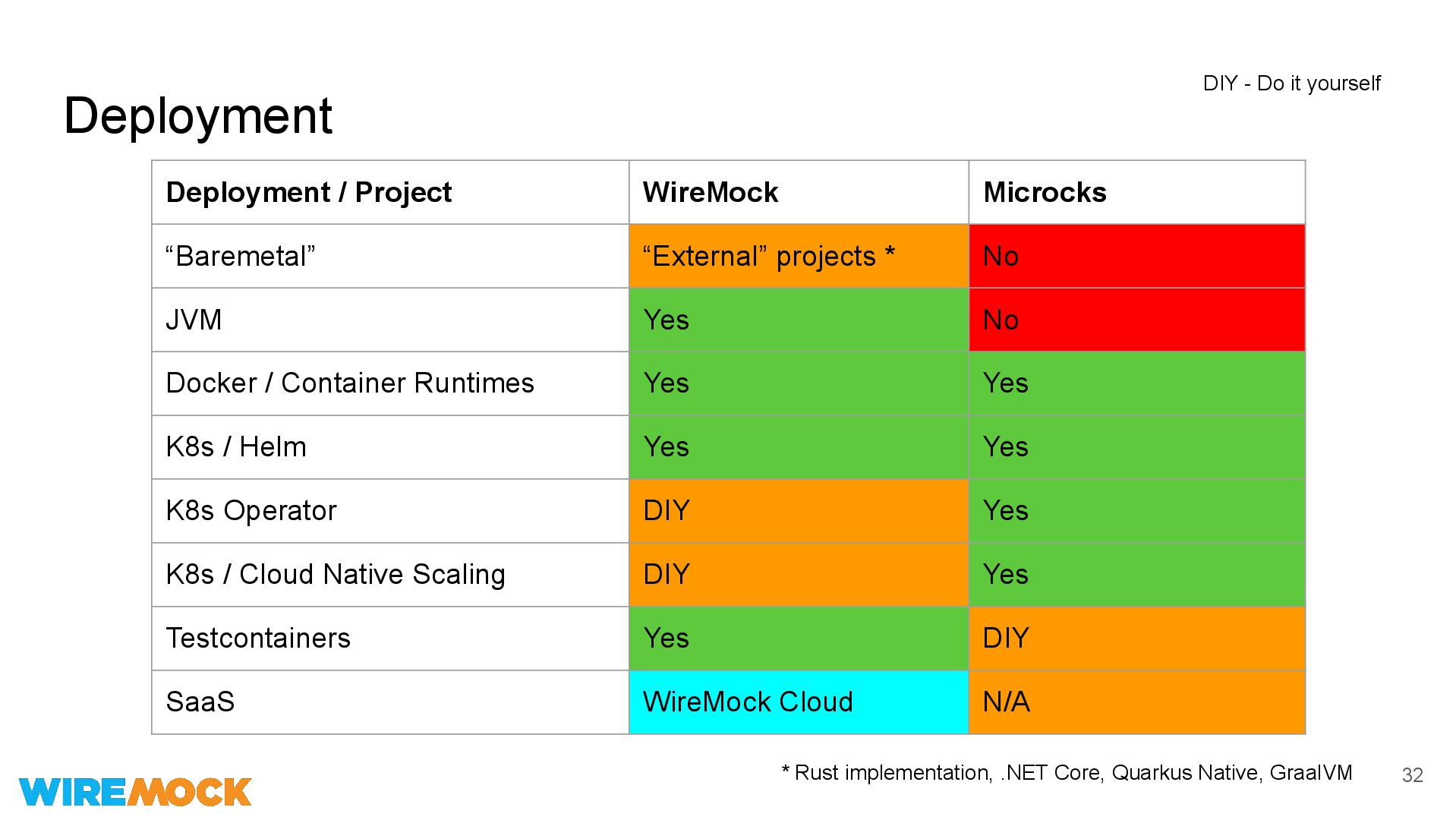 No JVM Yes No Docker / Container Runtimes Yes Yes K8s / Helm Yes Yes K8s Operator DIY Yes K8s / Cloud Native Scaling DIY Yes Testcontainers Yes DIY SaaS WireMock Cloud N/A Deployment * Rust implementation, .NET Core, Quarkus Native, GraalVM DIY - Do it yourself