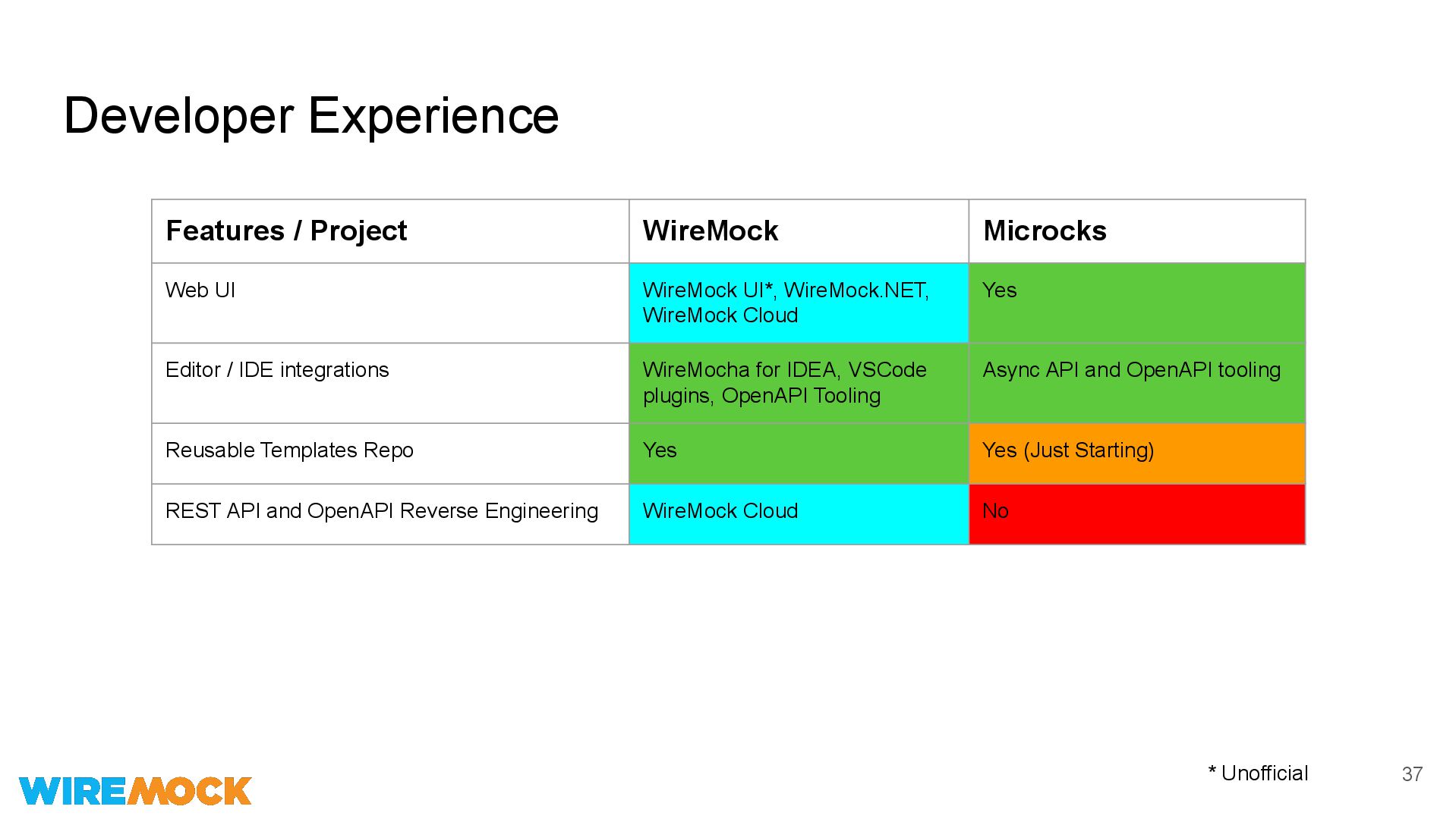 WireMock UI*, WireMock.NET, WireMock Cloud Yes Editor / IDE integrations WireMocha for IDEA, VSCode plugins, OpenAPI Tooling Async API and OpenAPI tooling Reusable Templates Repo Yes Yes (Just Starting) REST API and OpenAPI Reverse Engineering WireMock Cloud No * Unofficial