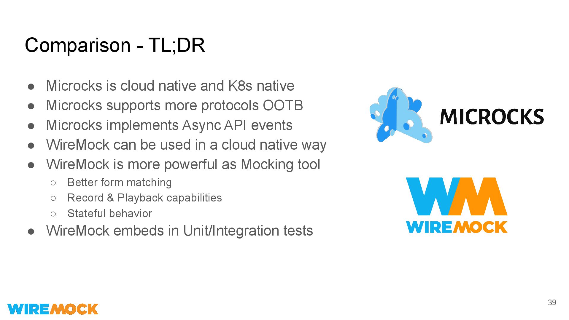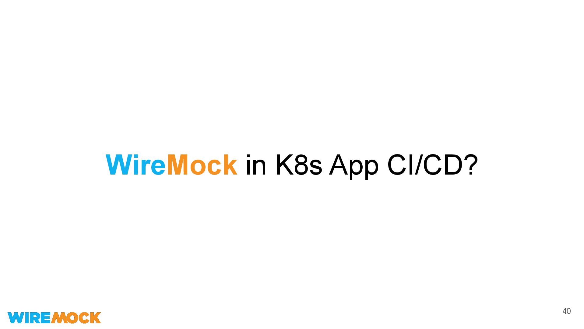 native • Microcks supports more protocols OOTB • Microcks implements Async API events • WireMock can be used in a cloud native way • WireMock is more powerful as Mocking tool ◦ Better form matching ◦ Record & Playback capabilities ◦ Stateful behavior • WireMock embeds in Unit/Integration tests 39