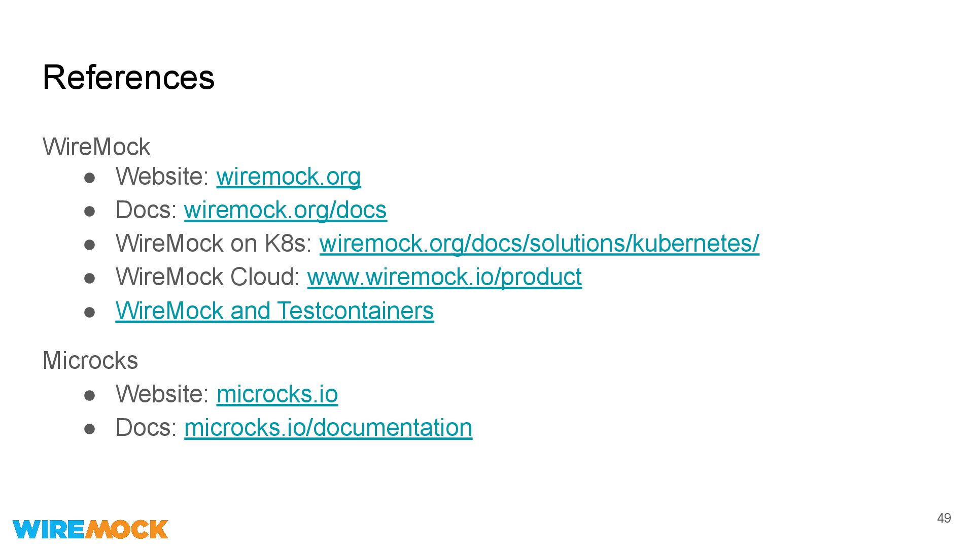 on K8s: wiremock.org/docs/solutions/kubernetes/ • WireMock Cloud: www.wiremock.io/product • WireMock and Testcontainers Microcks • Website: microcks.io • Docs: microcks.io/documentation 49