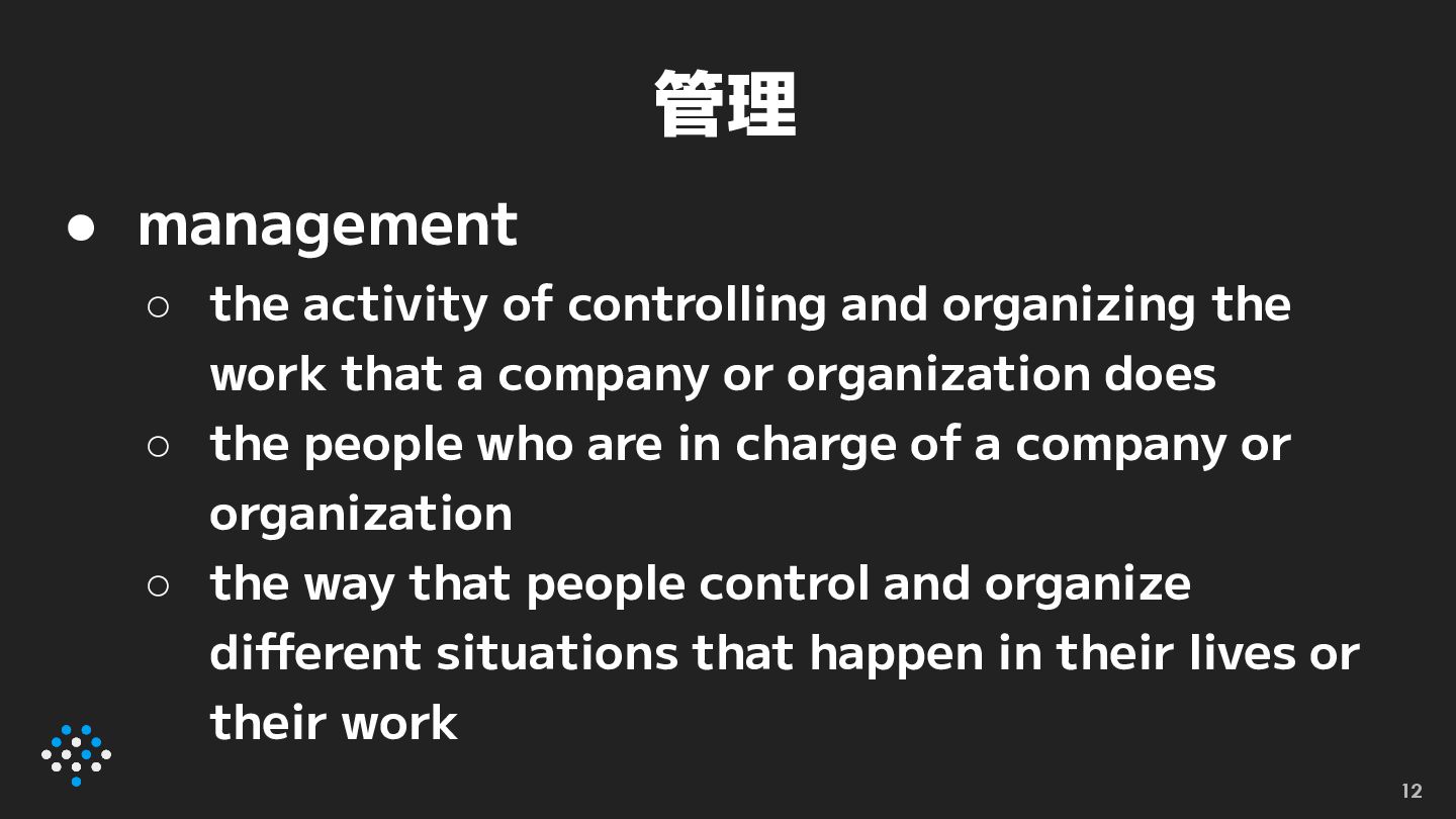 the work that a company or organization does ◦ the people who are in charge of a company or organization ◦ the way that people control and organize different situations that happen in their lives or their work 12