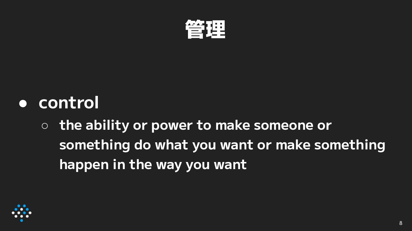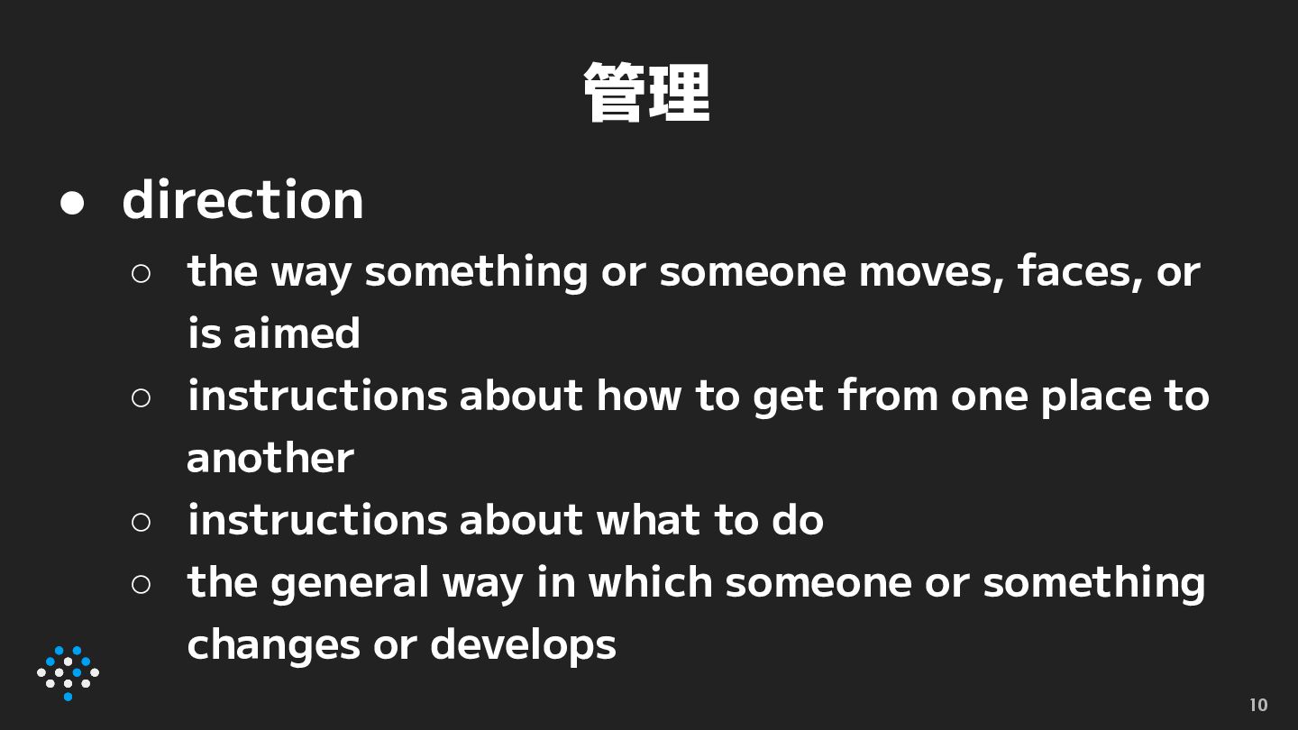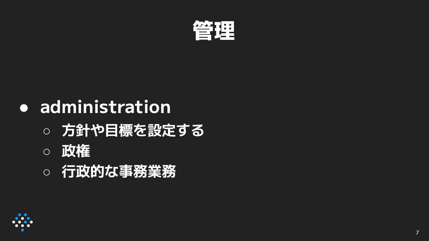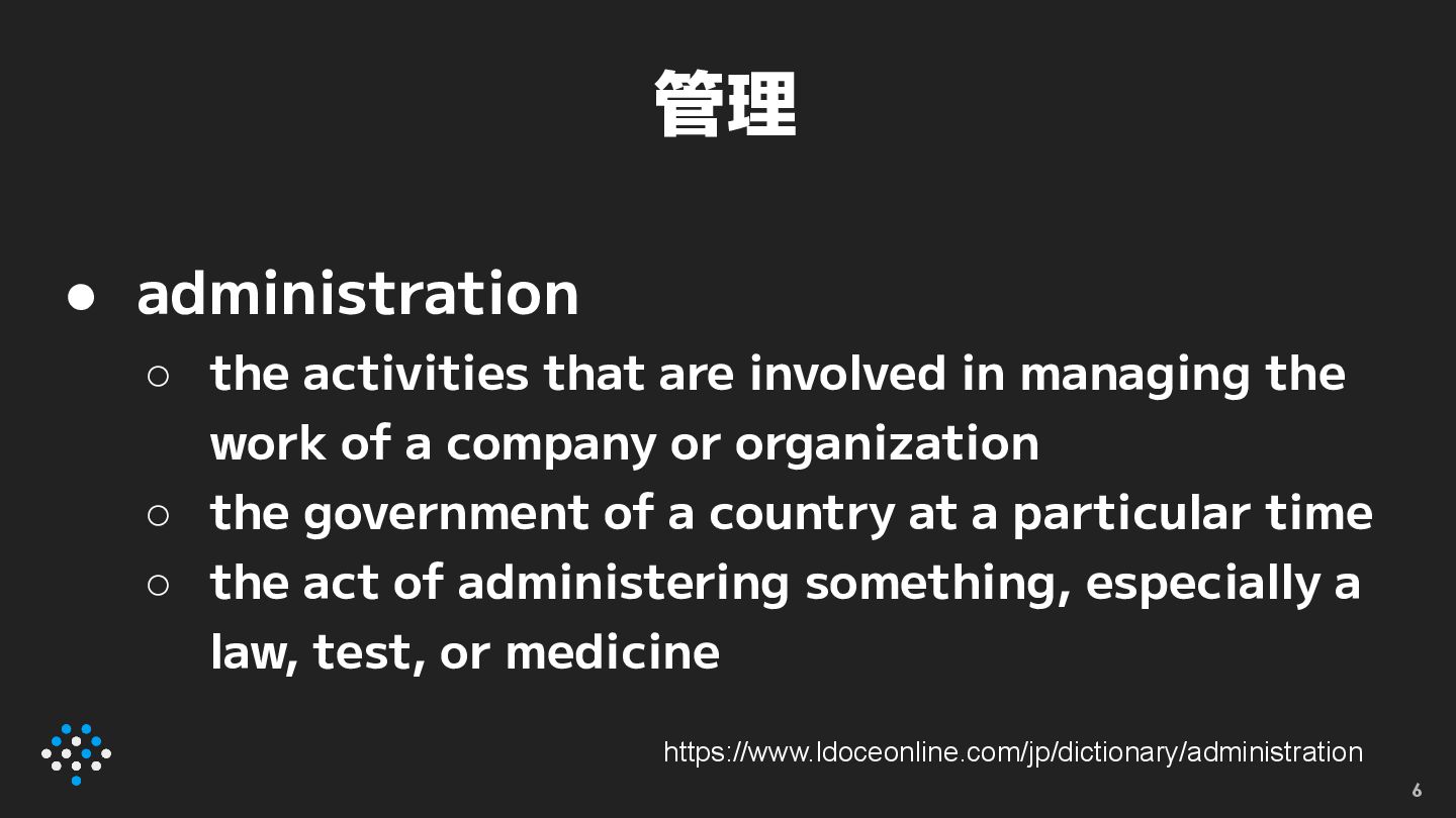 managing the work of a company or organization ◦ the government of a country at a particular time ◦ the act of administering something, especially a law, test, or medicine 6 https://www.ldoceonline.com/jp/dictionary/administration