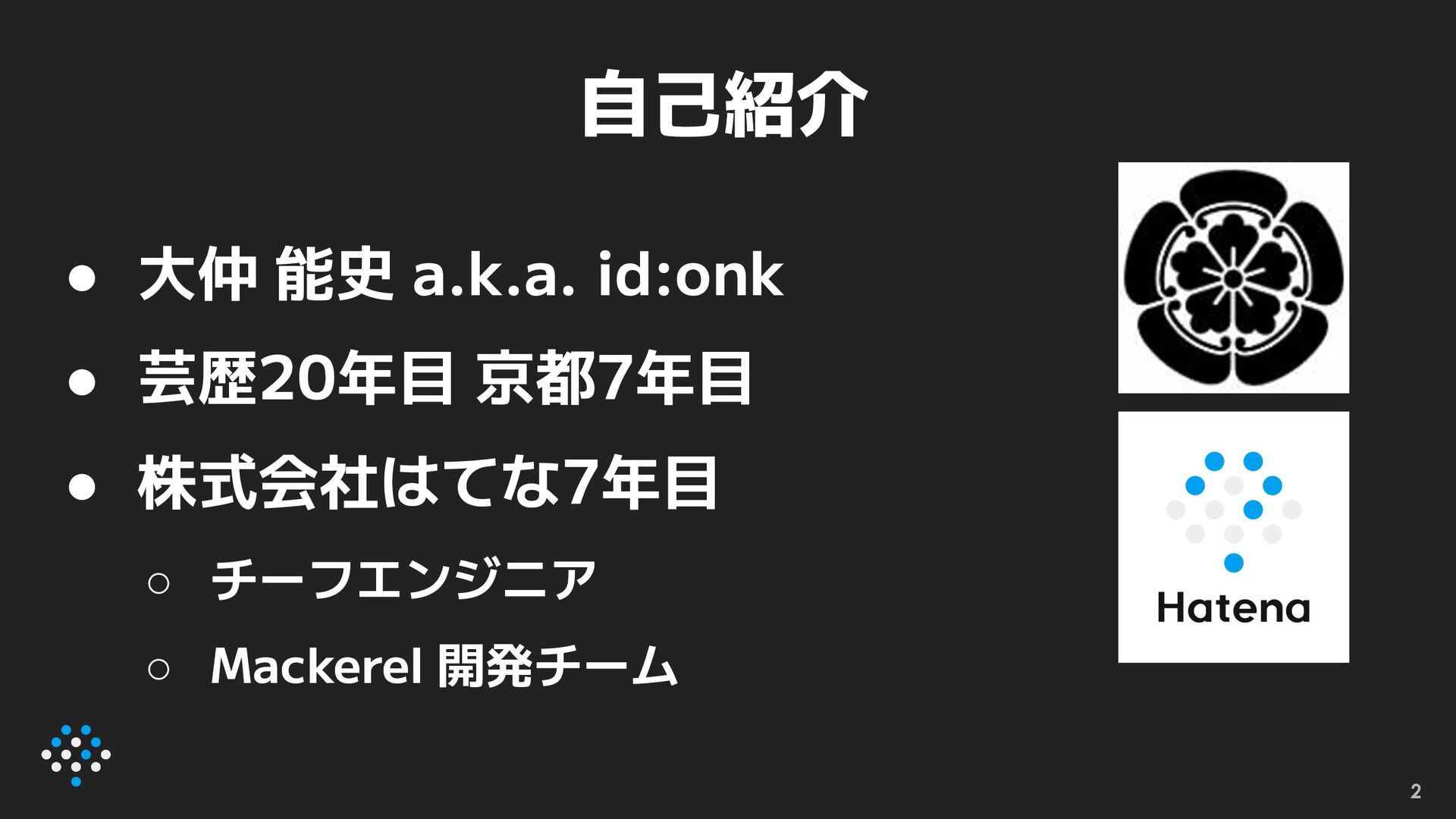 • 大仲 能史 a.k.a. id:onk • 芸歴20年目 京都7年目 • 株式会社はてな7年目