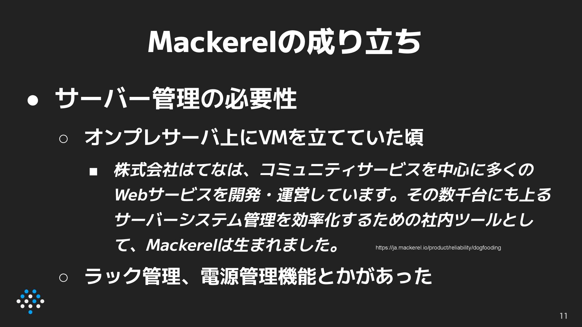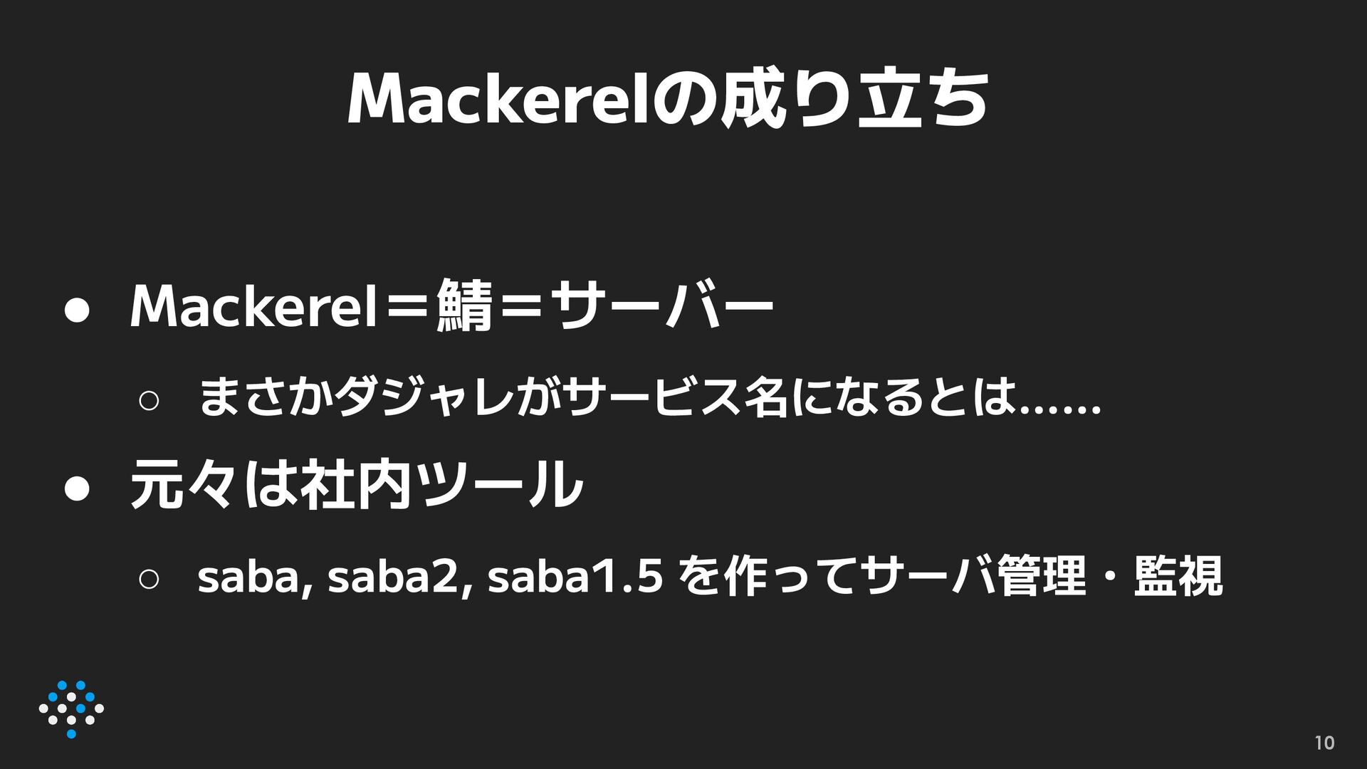 Mackerelの成り立ち 10 • Mackerel=鯖=サーバー ◦ まさかダジャレがサービス名になるとは…… • 元々は社内ツール ◦ saba,