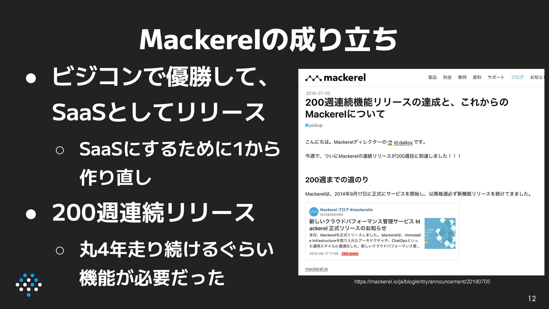 Mackerelの成り立ち 12 https://mackerel.io/ja/blog/entry/announcement/20180705 • ビジコンで優勝して、 SaaSとしてリリース ◦ SaaSにするために1から 作り直し •