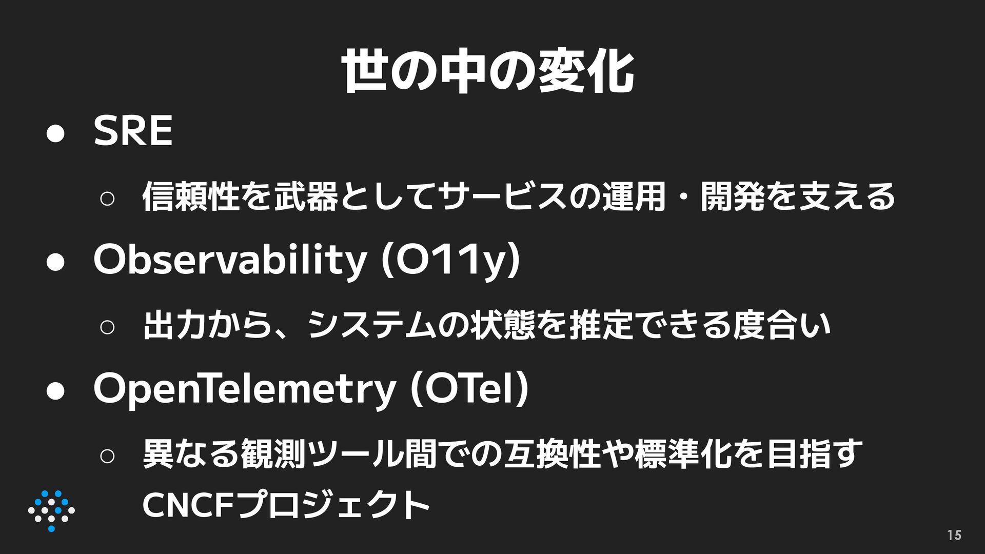 OpenTelemetry (OTel) ◦ 異なる観測ツール間での互換性や標準化を目指す CNCFプロジェクト 世の中の変化 15
