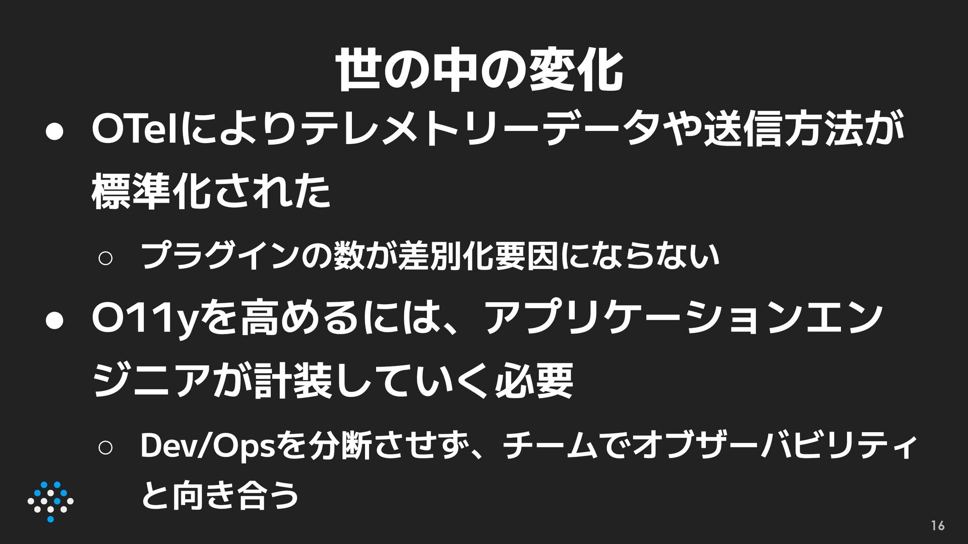 • OTelによりテレメトリーデータや送信方法が 標準化された ◦ プラグインの数が差別化要因にならない • O11yを高めるには、アプリケーションエン ジニアが計装していく必要 ◦ Dev/Opsを分断させず、チームでオブザーバビリティ