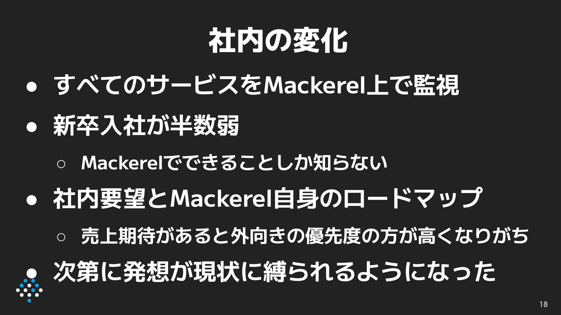 • すべてのサービスをMackerel上で監視 • 新卒入社が半数弱 ◦ Mackerelでできることしか知らない • 社内要望とMackerel自身のロードマップ ◦ 売上期待があると外向きの優先度の方が高くなりがち