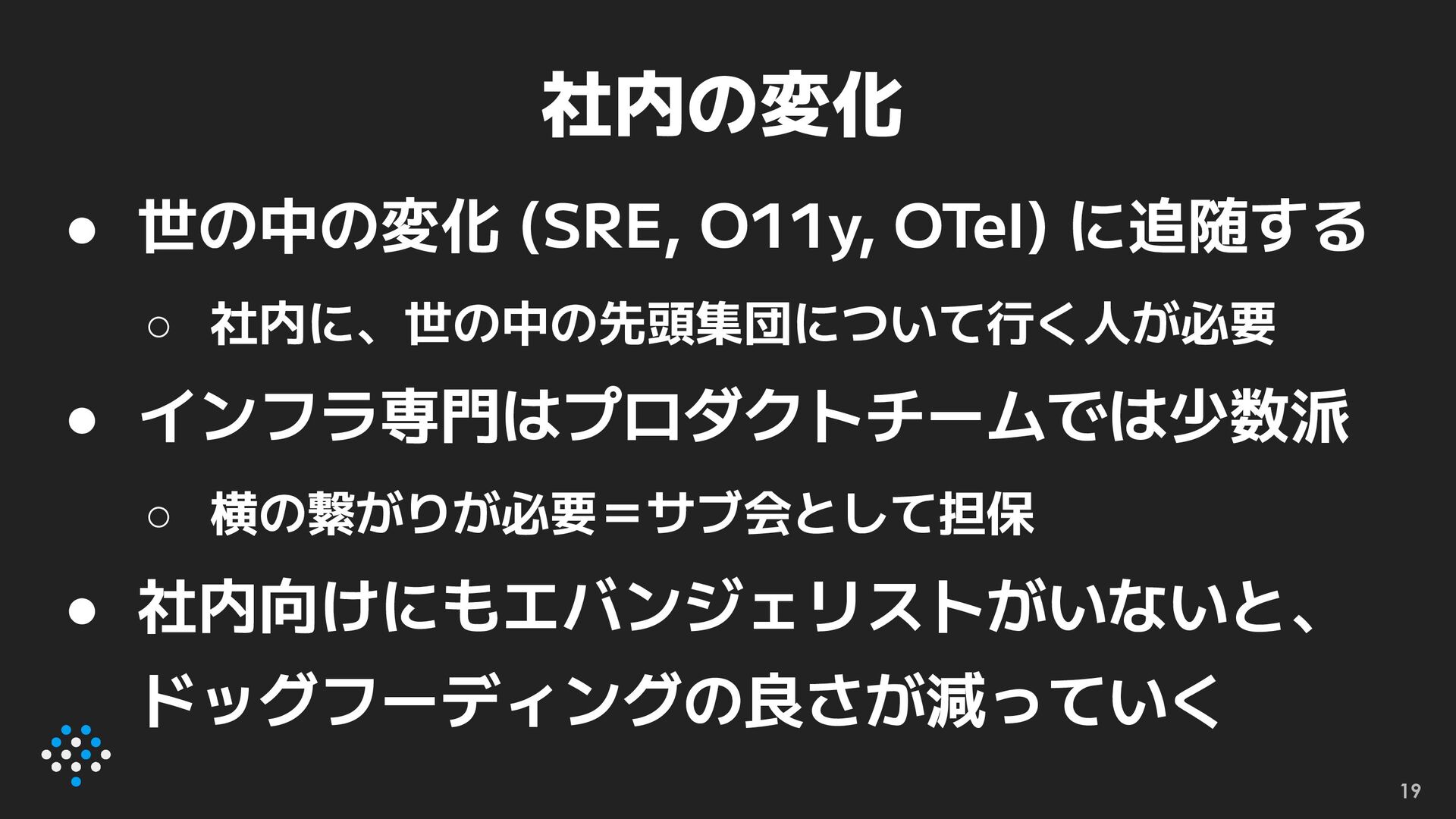 • 世の中の変化 (SRE, O11y, OTel) に追随する ◦ 社内に、世の中の先頭集団について行く人が必要 • インフラ専門はプロダクトチームでは少数派
