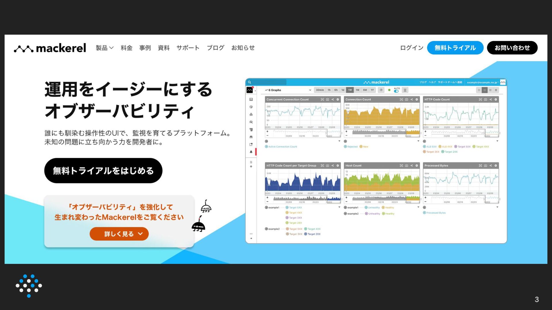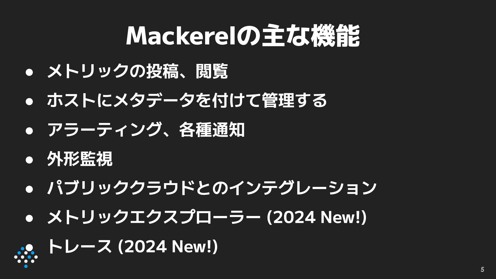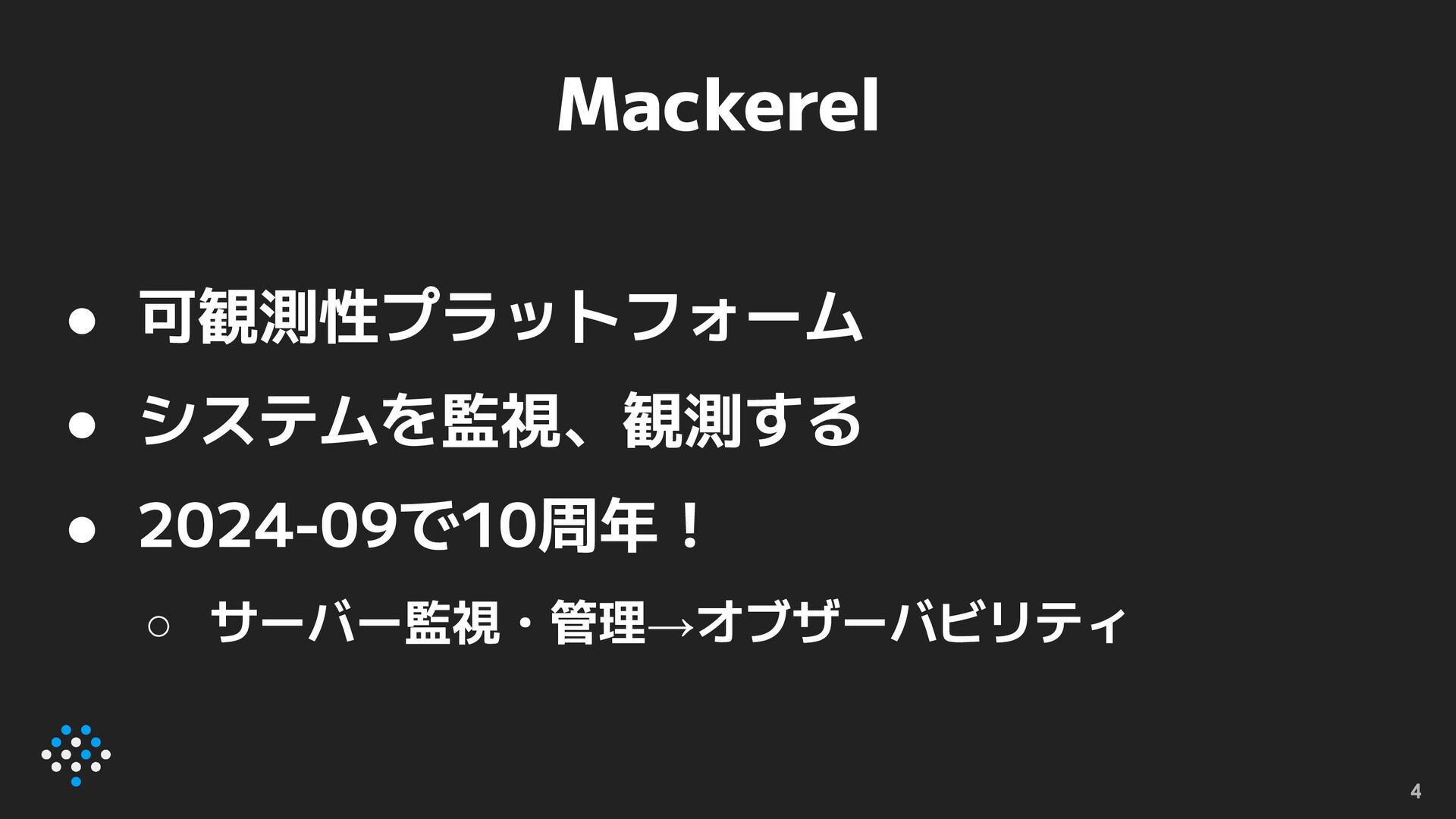 Mackerel 4 • 可観測性プラットフォーム • システムを監視、観測する • 2024-09で10周年! ◦ サーバー監視・管理→オブザーバビリティ