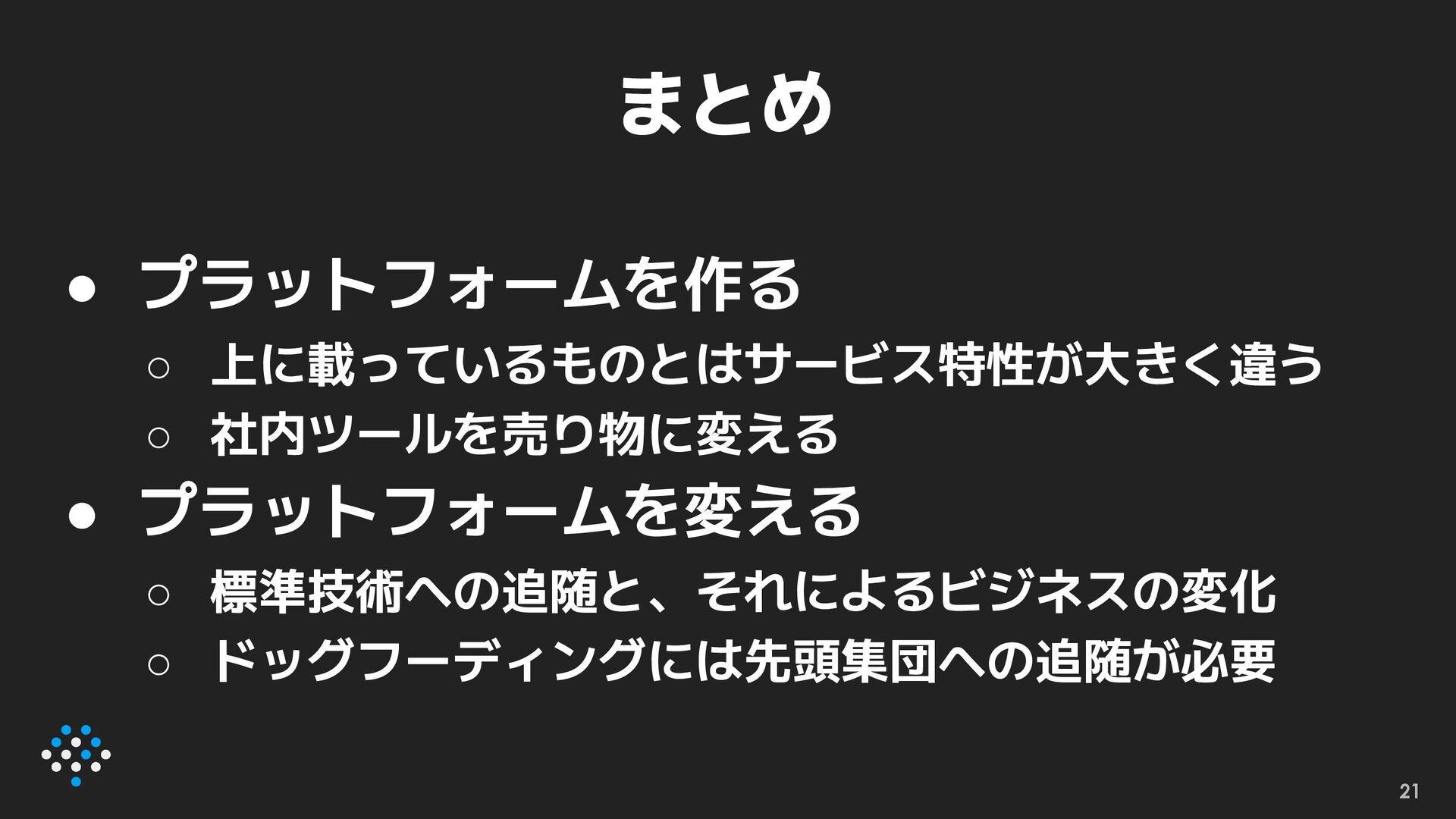 まとめ • プラットフォームを作る ◦ 上に載っているものとはサービス特性が大きく違う ◦ 社内ツールを売り物に変える • プラットフォームを変える ◦
