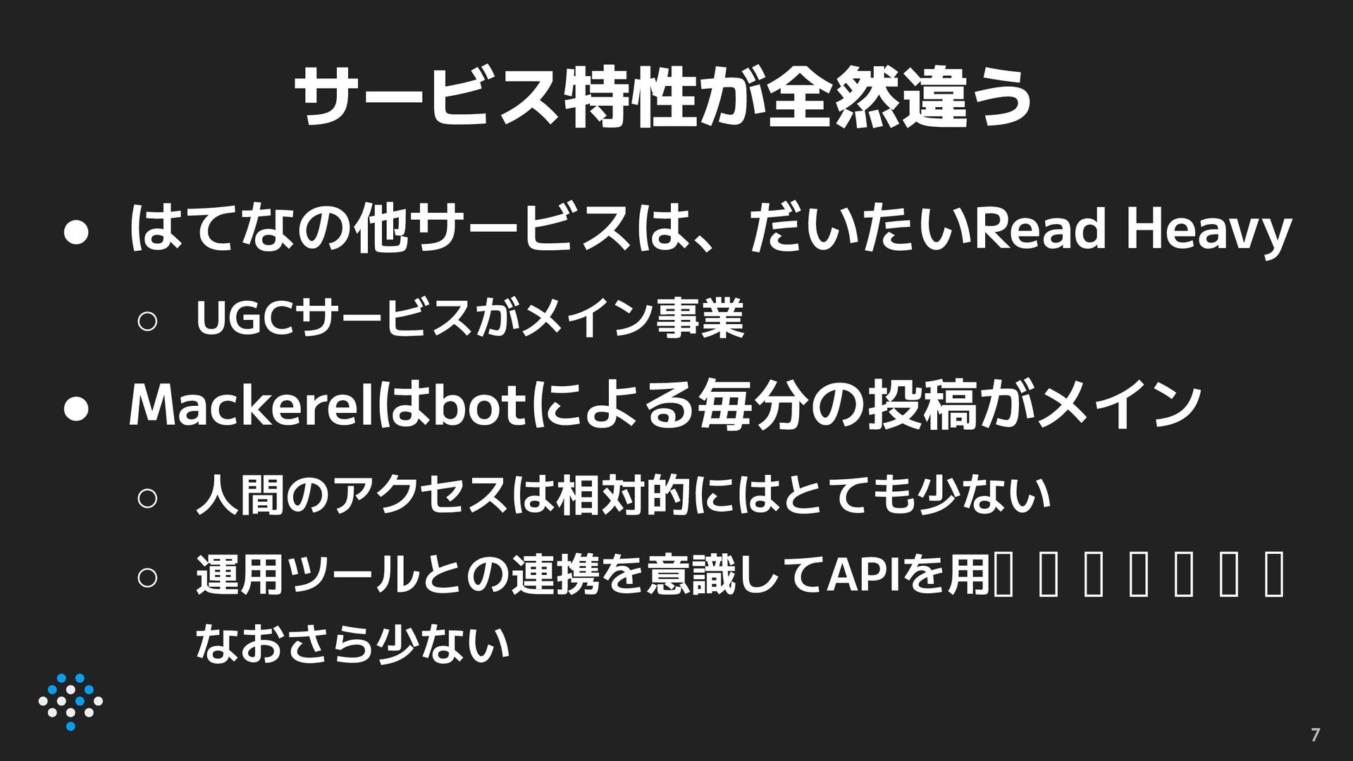 • はてなの他サービスは、だいたいRead Heavy ◦ UGCサービスがメイン事業 • Mackerelはbotによる毎分の投稿がメイン ◦ 人間のアクセスは相対的にはとても少ない ◦