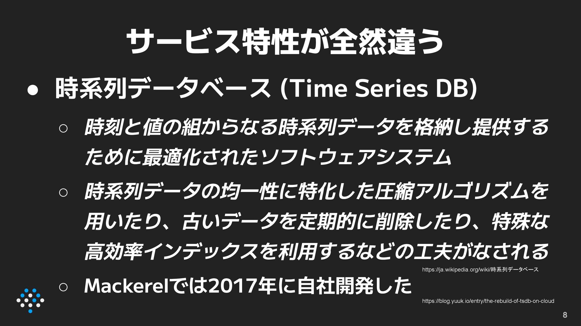 用いたり、古いデータを定期的に削除したり、特殊な 高効率インデックスを利用するなどの工夫がなされる ◦ Mackerelでは2017年に自社開発した サービス特性が全然違う 8 https://ja.wikipedia.org/wiki/時系列データベース https://blog.yuuk.io/entry/the-rebuild-of-tsdb-on-cloud