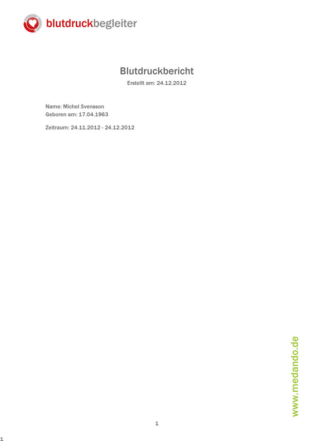 1 www.medando.de Blutdruckbericht Erstellt am: 24.12.2012 Name: Michel Svensson Geboren