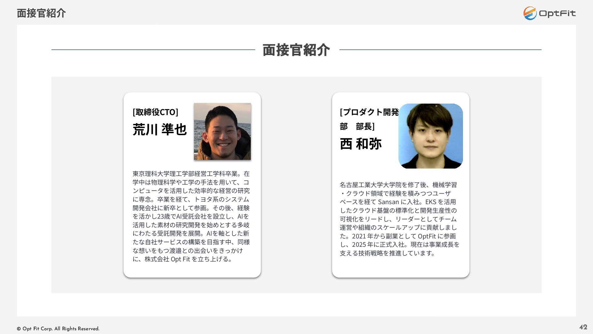 Corp. All Rights Reserved. 技術スタック 技術スタック 24 ⾔語 Python, JavaScript, HTML5, htmx フレーム ワーク Django, Alpine.js, Tailwind.css,React, Next.js DB PostgreSQL ミドルウェア Nginx, Redis, Docker OS Linux クラウド サービス AWS, さくらのクラウド ⾔語 Python ライブラリ Pytorch, Tensorflow, ONNX runtime, Numpy, scikit-learn, Jupyter Notebook OS Linux 検証環境 ⾃社サーバー(Ubuntu 22.04, Intelll Core i9-10980XE, GPU NVIDIA RTX A5000 4機) ⾔語 Python, C, C++ 使⽤デバイス Raspberry Pi 5, Jetson orin nano, nRF52, ESP32 開発環境 VS Code, SEGGER Embedded Studio, Arduino IDE コミュニケーション Slack ドキュメント管理 Notion, Google Workspace タスク管理 Notion コード管理 GitHub PC Mac, Windows (選択可) 全社ツール Web AI‧データサイエンス IoT