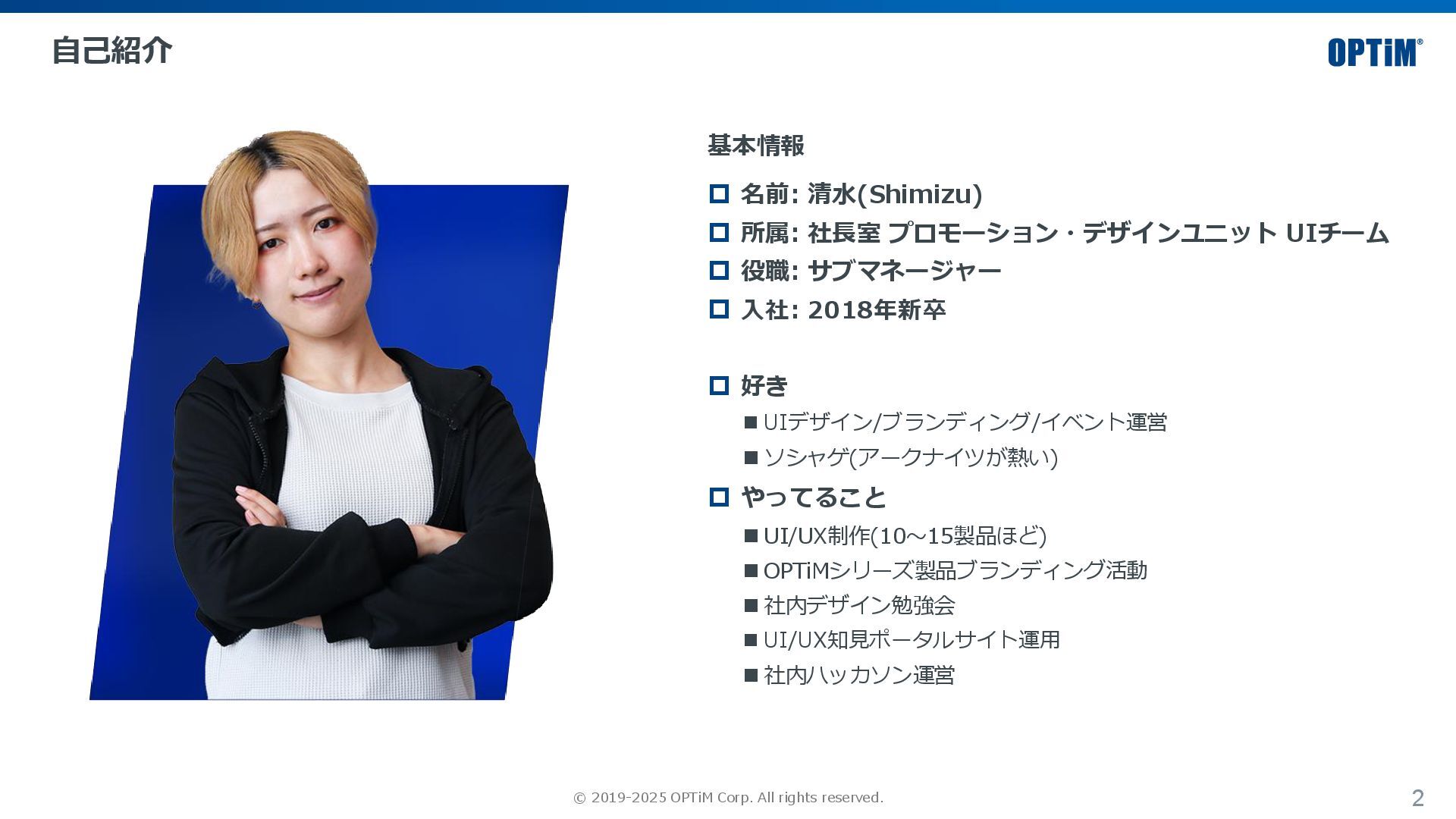 名前: 清水(Shimizu) 所属: 社長室 プロモーション・デザインユニット UIチーム 役職: サブマネージャー 入社: 2018年新卒 好き ◼ UIデザイン/ブランディング/イベント運営 ◼ ソシャゲ(アークナイツが熱い) やってること ◼ UI/UX制作(10〜15製品ほど) ◼ OPTiMシリーズ製品ブランディング活動 ◼ 社内デザイン勉強会 ◼ UI/UX知見ポータルサイト運用 ◼ 社内ハッカソン運営