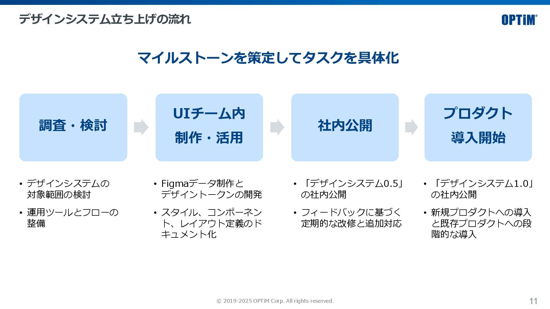 © 2019-2025 OPTiM Corp. All rights reserved. 11 デザインシステム立ち上げの流れ 調査・検討