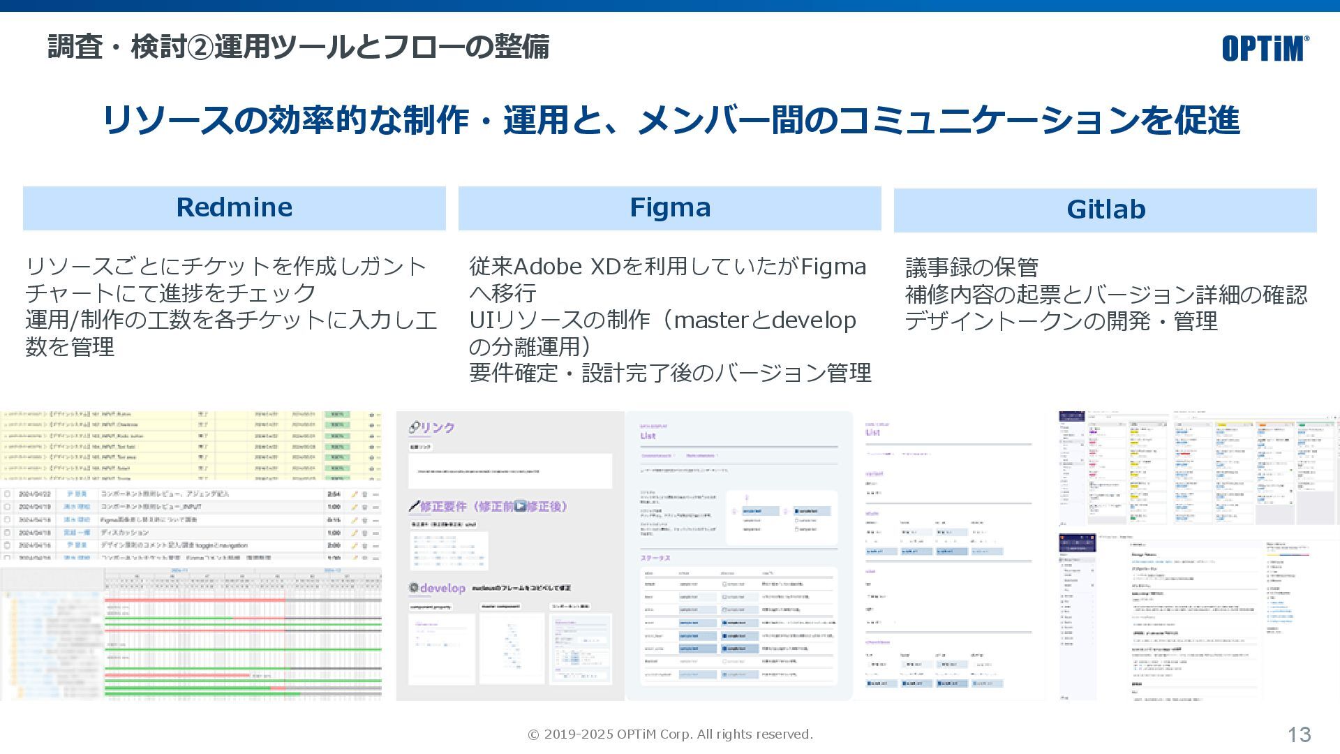 © 2019-2025 OPTiM Corp. All rights reserved. 13 調査・検討②運用ツールとフローの整備 リソースの効率的な制作・運用と、メンバー間のコミュニケーションを促進