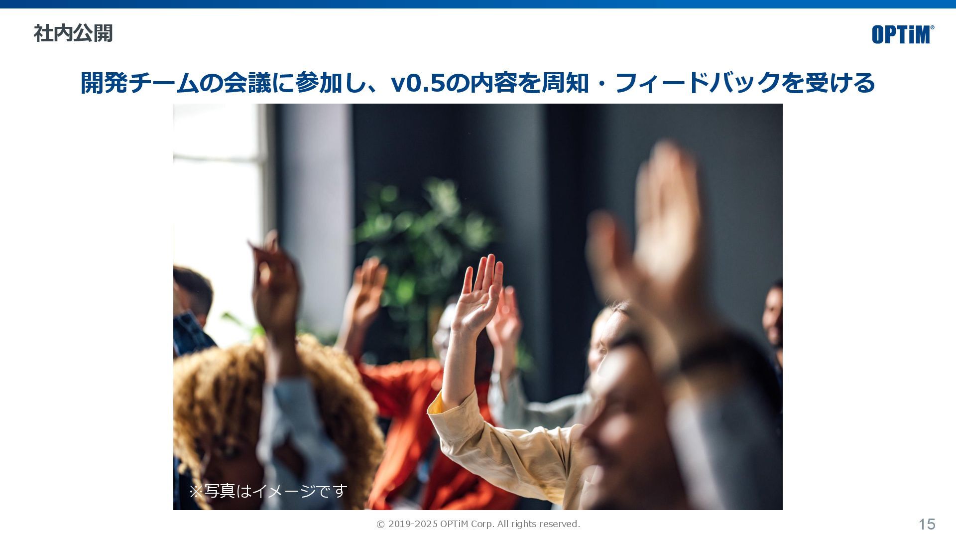 © 2019-2025 OPTiM Corp. All rights reserved. 15 社内公開 開発チームの会議に参加し、v0.5の内容を周知・フィードバックを受ける