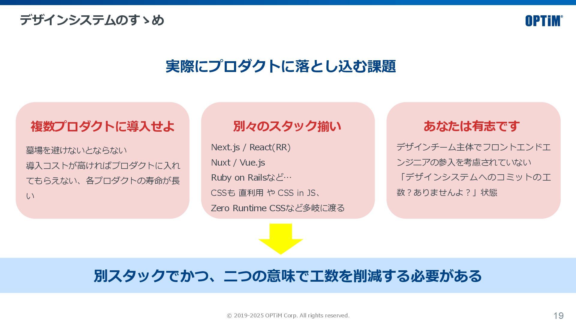 © 2019-2025 OPTiM Corp. All rights reserved. 19 デザインシステムのすゝめ 実際にプロダクトに落とし込む課題