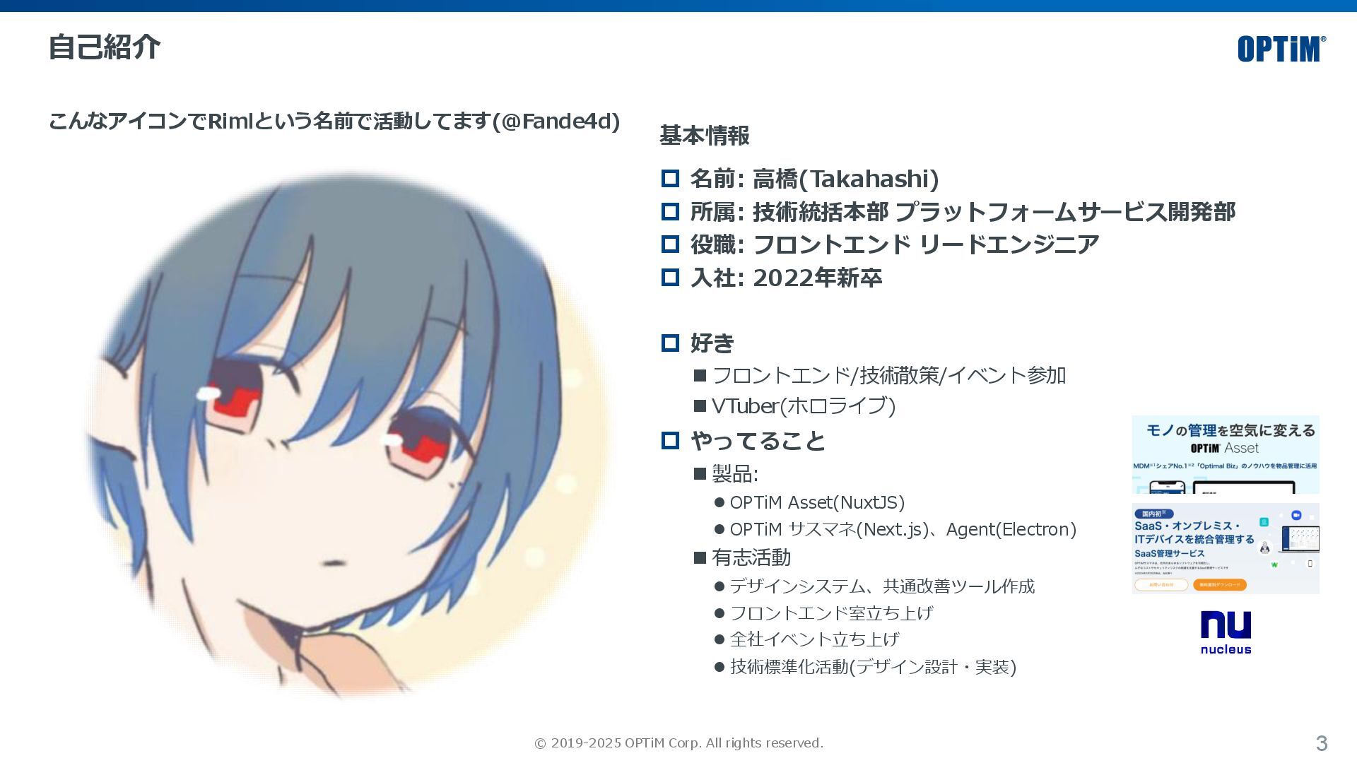 自己紹介 名前: 高橋(Takahashi) 所属: 技術統括本部 プラットフォームサービス開発部 役職: フロントエンド リードエンジニア 入社: 2022年新卒 好き ◼ フロントエンド/技術散策/イベント参加 ◼ VTuber(ホロライブ) やってること ◼ 製品: ⚫ OPTiM Asset(NuxtJS) ⚫ OPTiM サスマネ(Next.js)、Agent(Electron) ◼ 有志活動 ⚫ デザインシステム、共通改善ツール作成 ⚫ フロントエンド室立ち上げ ⚫ 全社イベント立ち上げ ⚫ 技術標準化活動(デザイン設計・実装)