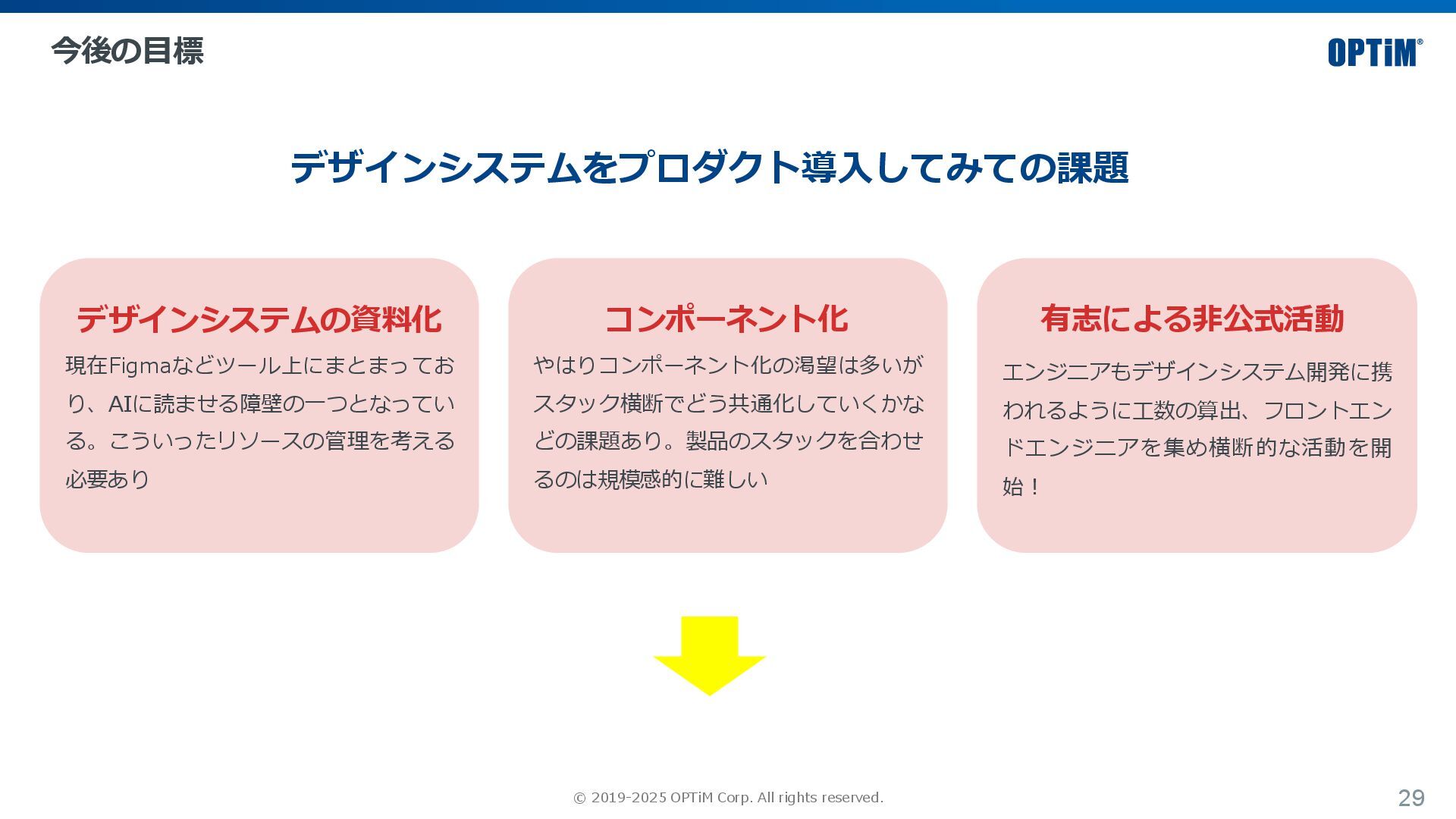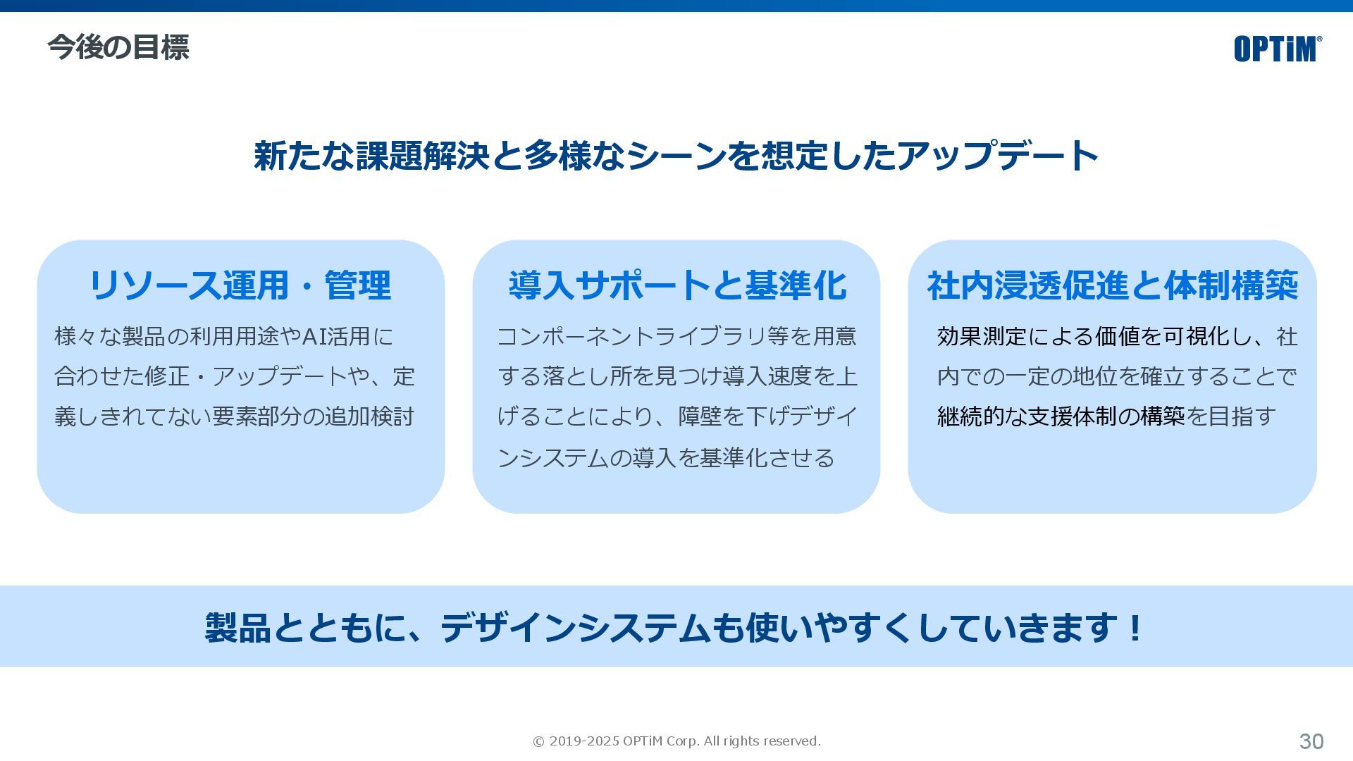 © 2019-2025 OPTiM Corp. All rights reserved. 29 今後の目標 デザインシステムをプロダクト導入してみての課題