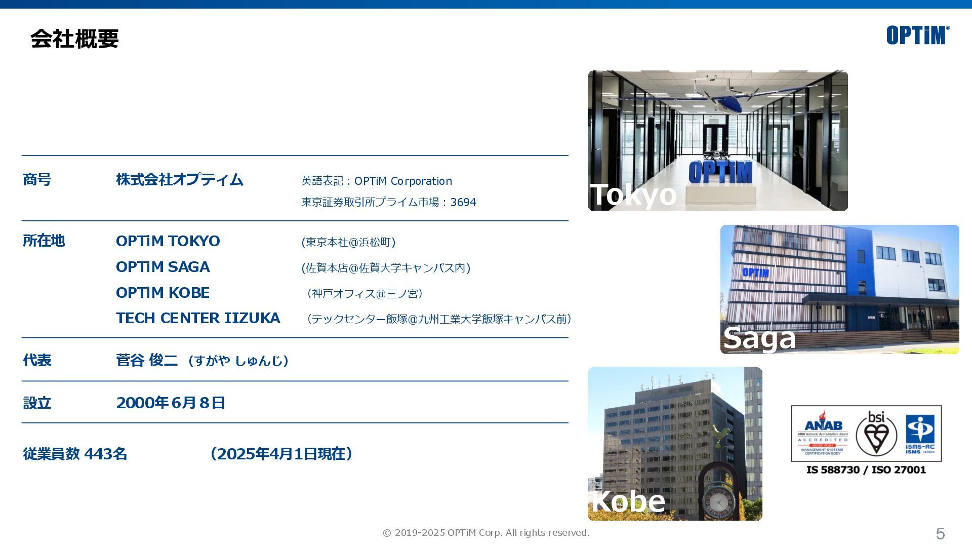 株式会社オプティム 英語表記:OPTiM Corporation 東京証券取引所プライム市場:3694 所在地 OPTiM TOKYO (東京本社@浜松町) OPTiM SAGA (佐賀本店@佐賀大学キャンパス内) OPTiM KOBE (神戸オフィス@三ノ宮) TECH CENTER IIZUKA (テックセンター飯塚@九州工業大学飯塚キャンパス前) 代表 菅谷 俊二 (すがや しゅんじ) 設立 2000年6月8日 従業員数 443名 (2025年4月1日現在) Saga Tokyo Kobe