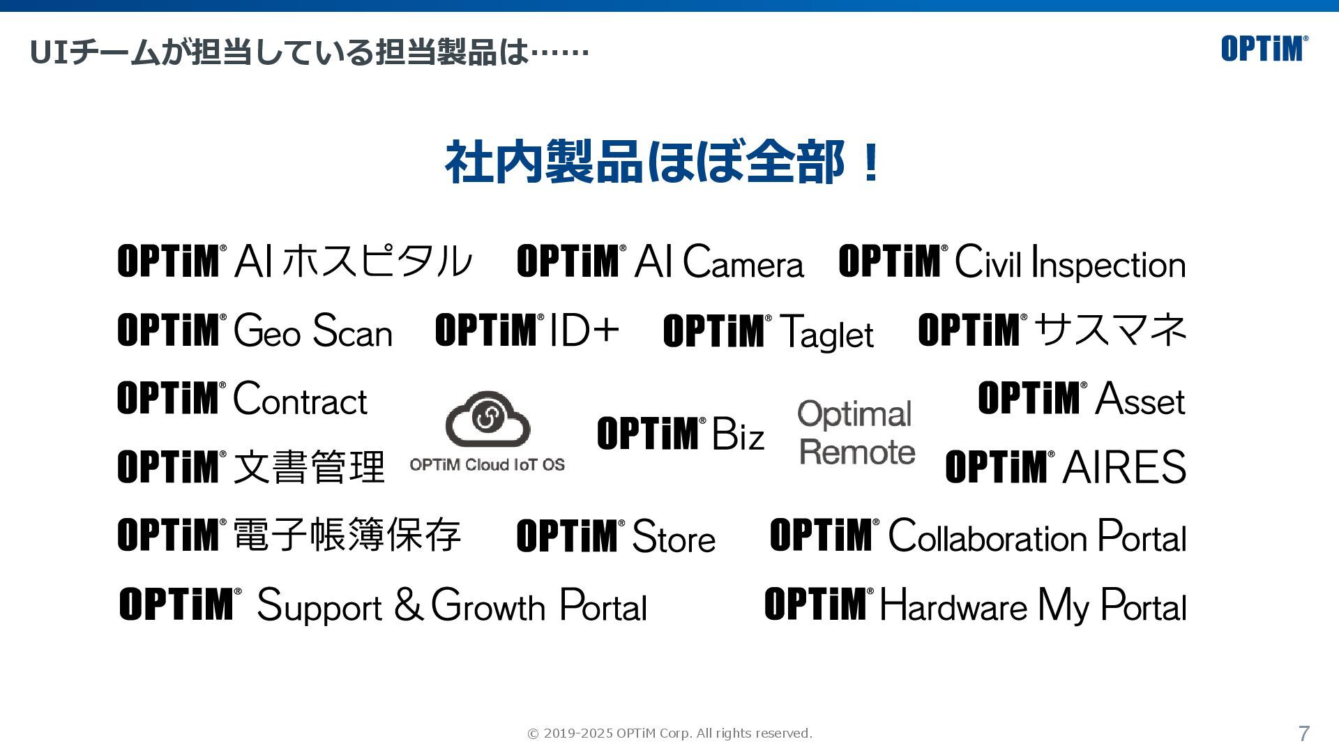 © 2019-2025 OPTiM Corp. All rights reserved. 7 UIチームが担当している担当製品は…… 社内製品ほぼ全部!