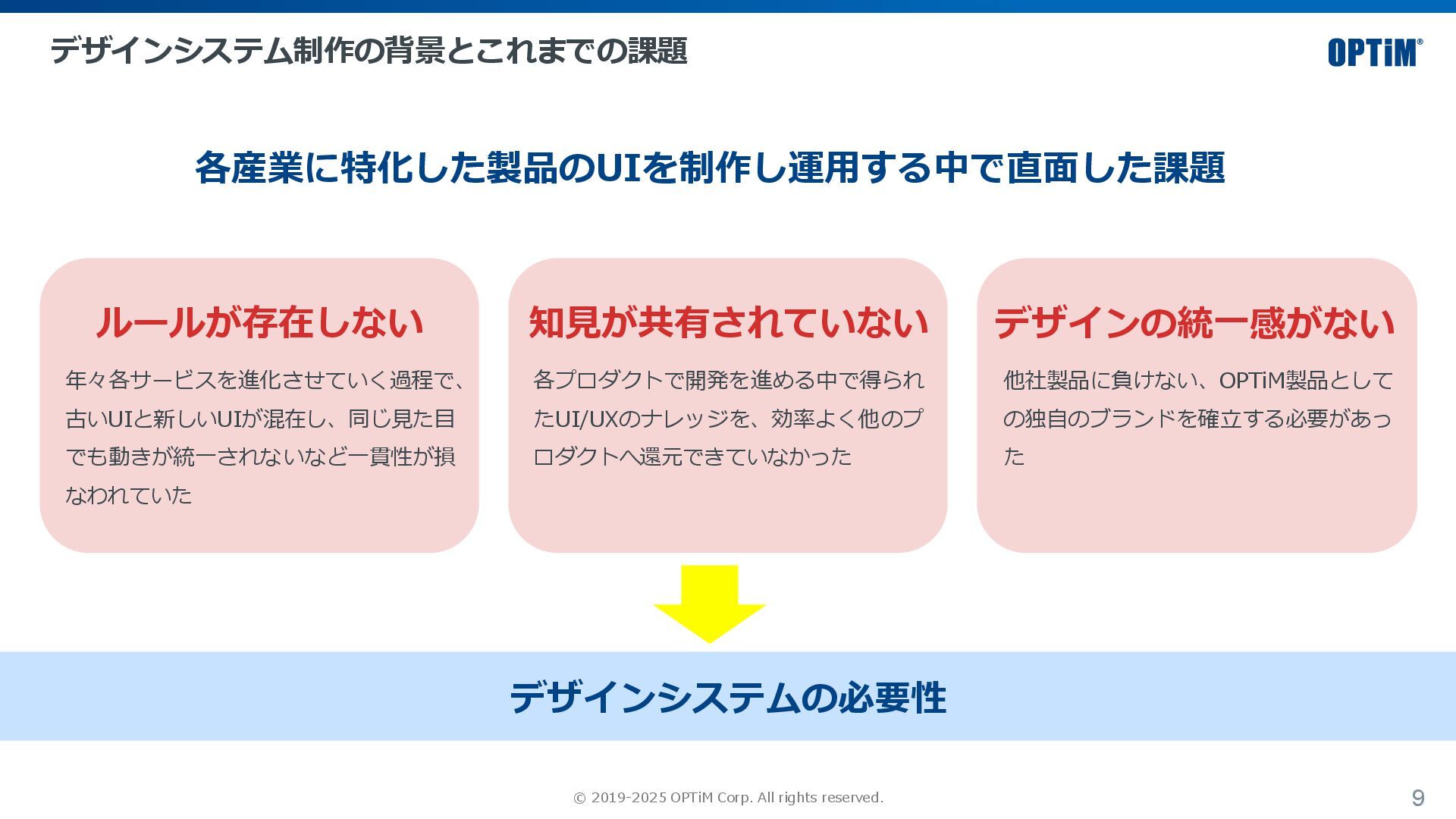 © 2019-2025 OPTiM Corp. All rights reserved. 9 デザインシステム制作の背景とこれまでの課題 各産業に特化した製品のUIを制作し運用する中で直面した課題