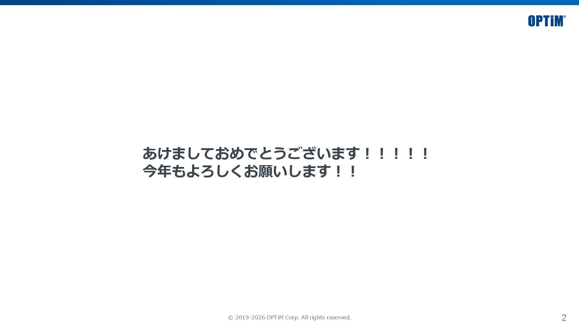 © 2019-2026 OPTiM Corp. All rights reserved. 2 あけましておめでとうございます!!!!! 今年もよろしくお願いします!!