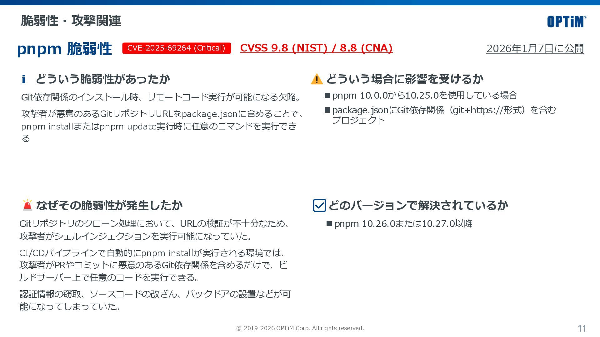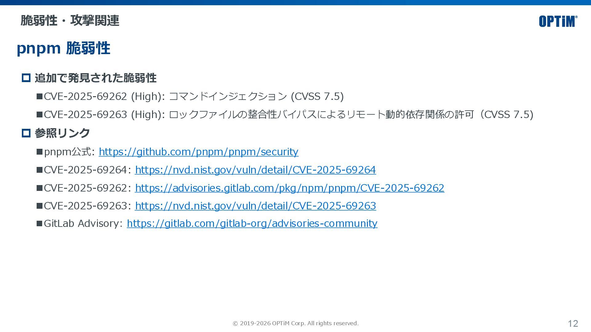 © 2019-2026 OPTiM Corp. All rights reserved. 11 脆弱性・攻撃関連 pnpm