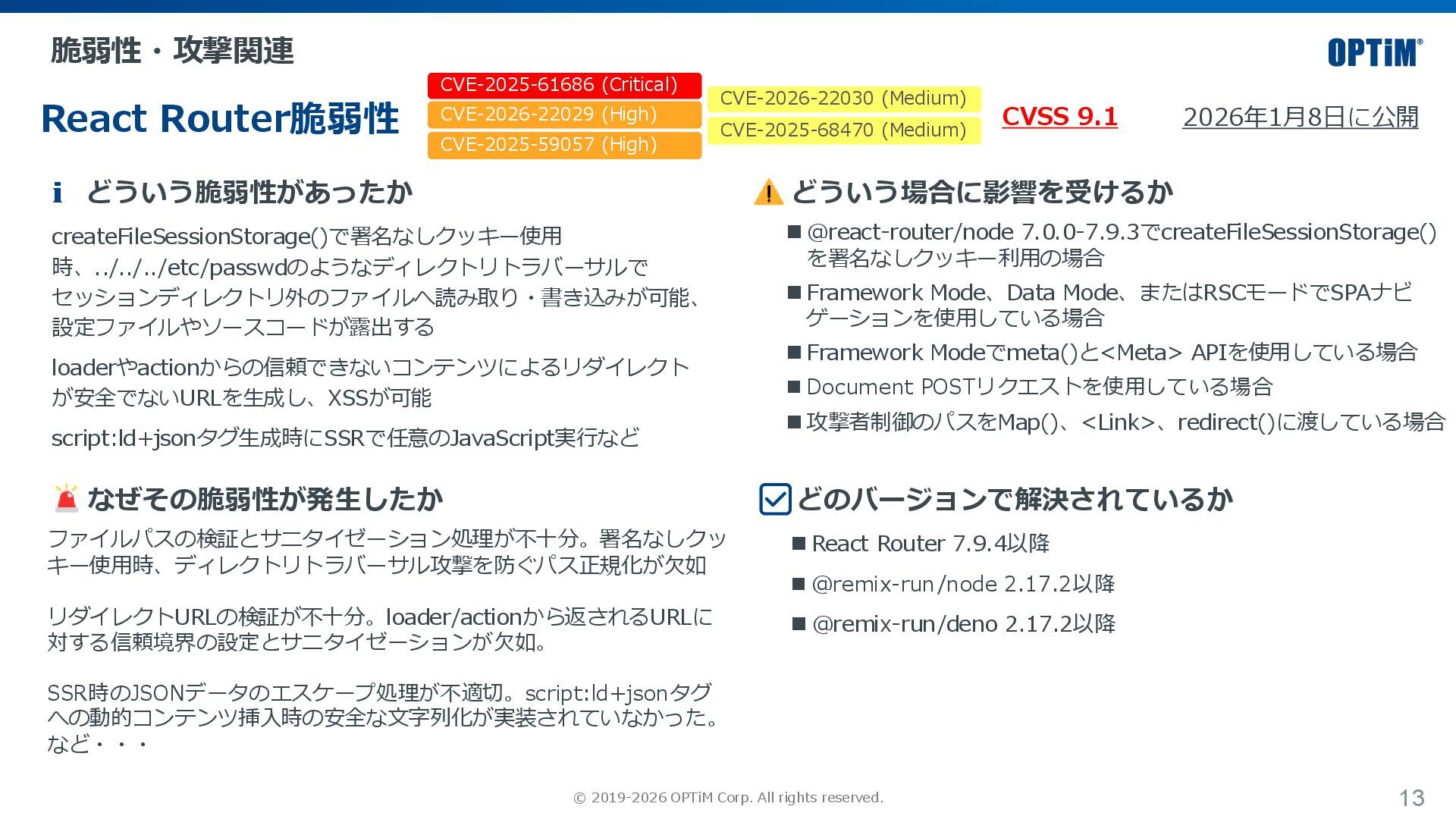 © 2019-2026 OPTiM Corp. All rights reserved. 13 脆弱性・攻撃関連 React