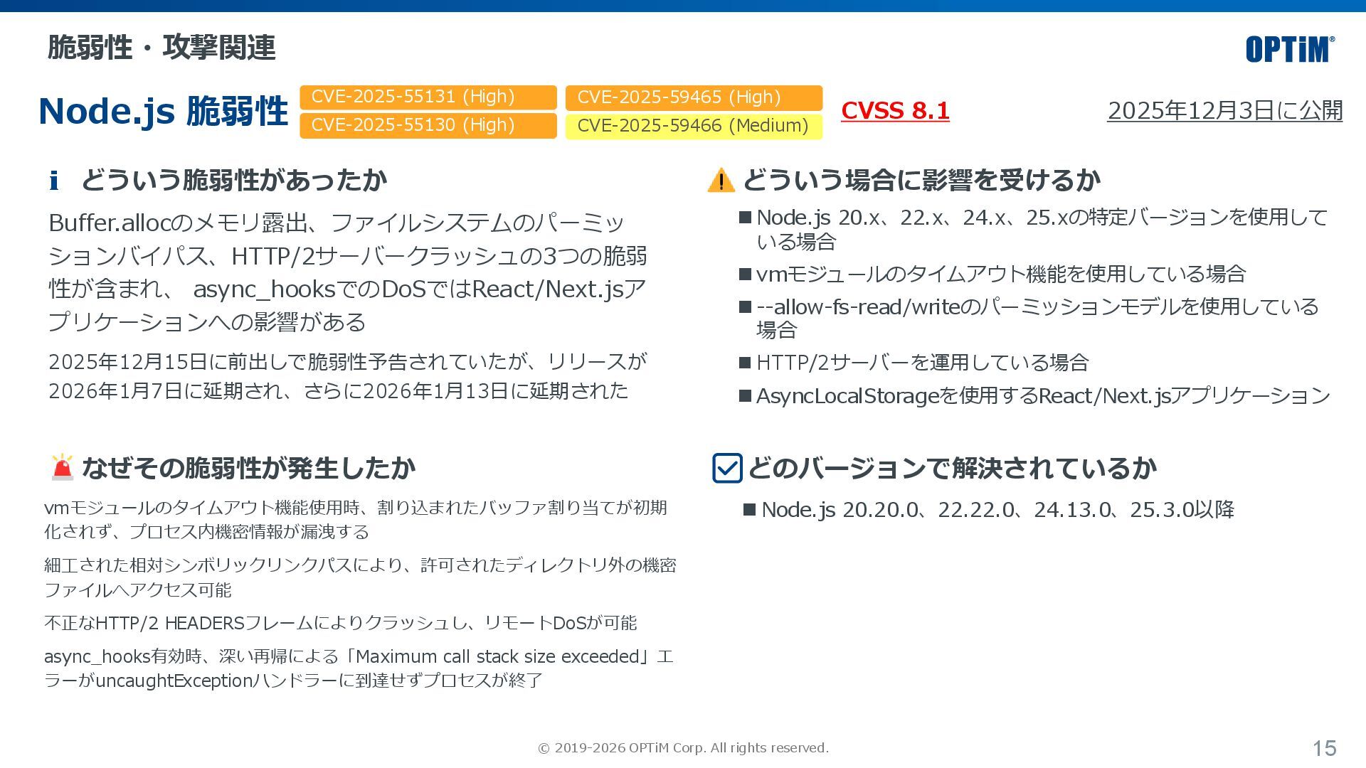© 2019-2026 OPTiM Corp. All rights reserved. 15 脆弱性・攻撃関連 Node.js