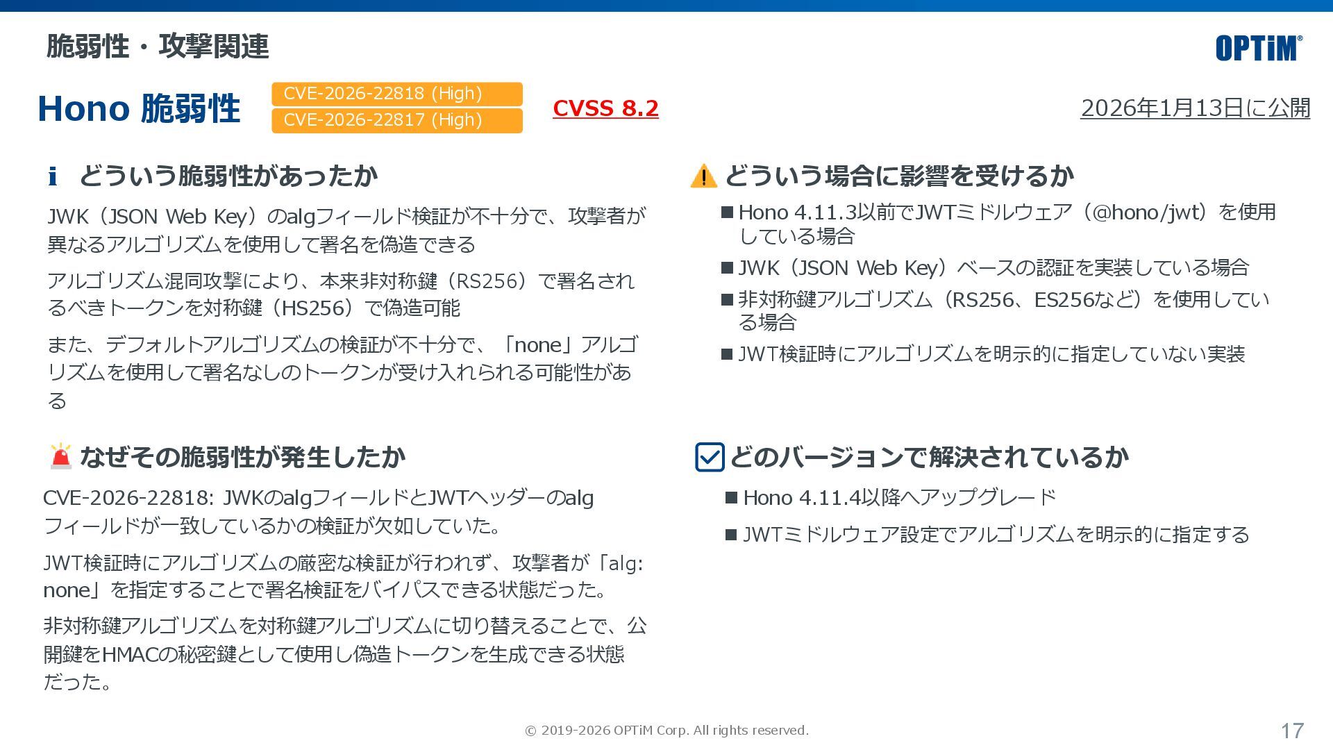 © 2019-2026 OPTiM Corp. All rights reserved. 17 脆弱性・攻撃関連 Hono