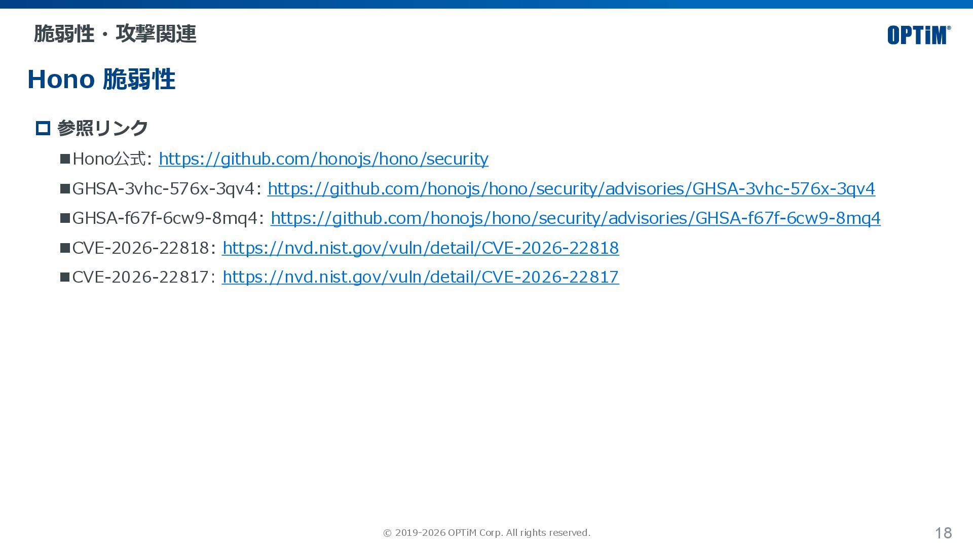 © 2019-2026 OPTiM Corp. All rights reserved. 18 脆弱性・攻撃関連 Hono