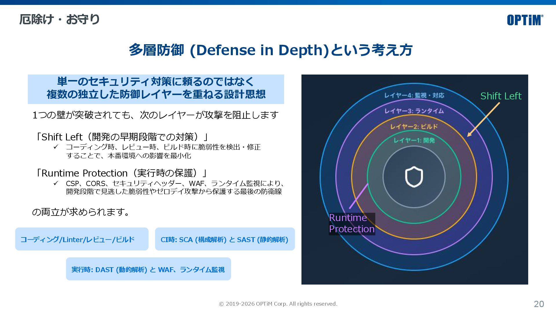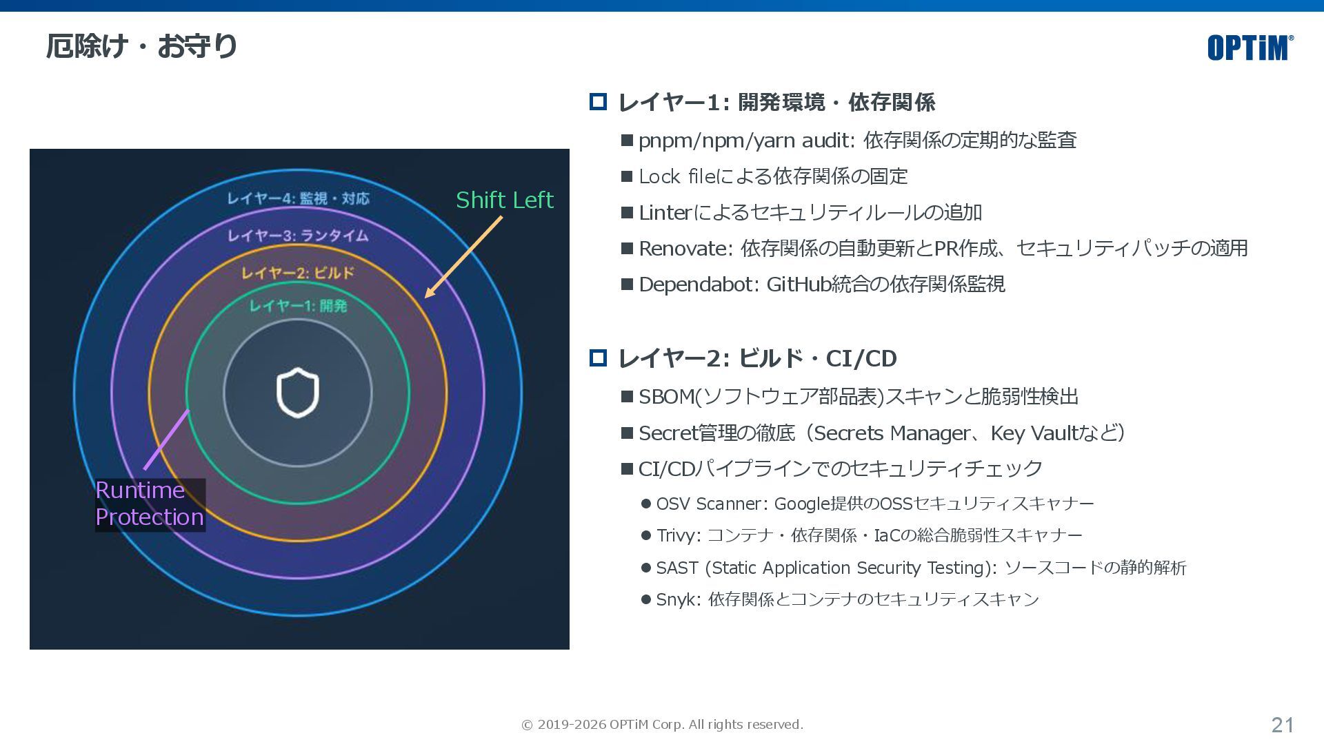 © 2019-2026 OPTiM Corp. All rights reserved. 20 厄除け・お守り 1つの壁が突破されても、次のレイヤーが攻撃を阻止します