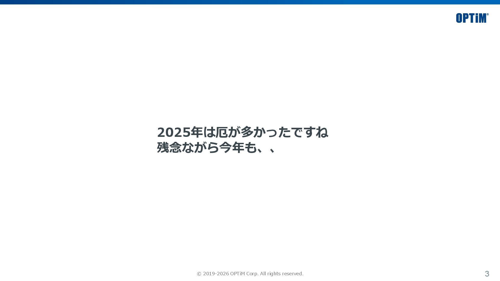 © 2019-2026 OPTiM Corp. All rights reserved. 3 2025年は厄が多かったですね 残念ながら今年も、、