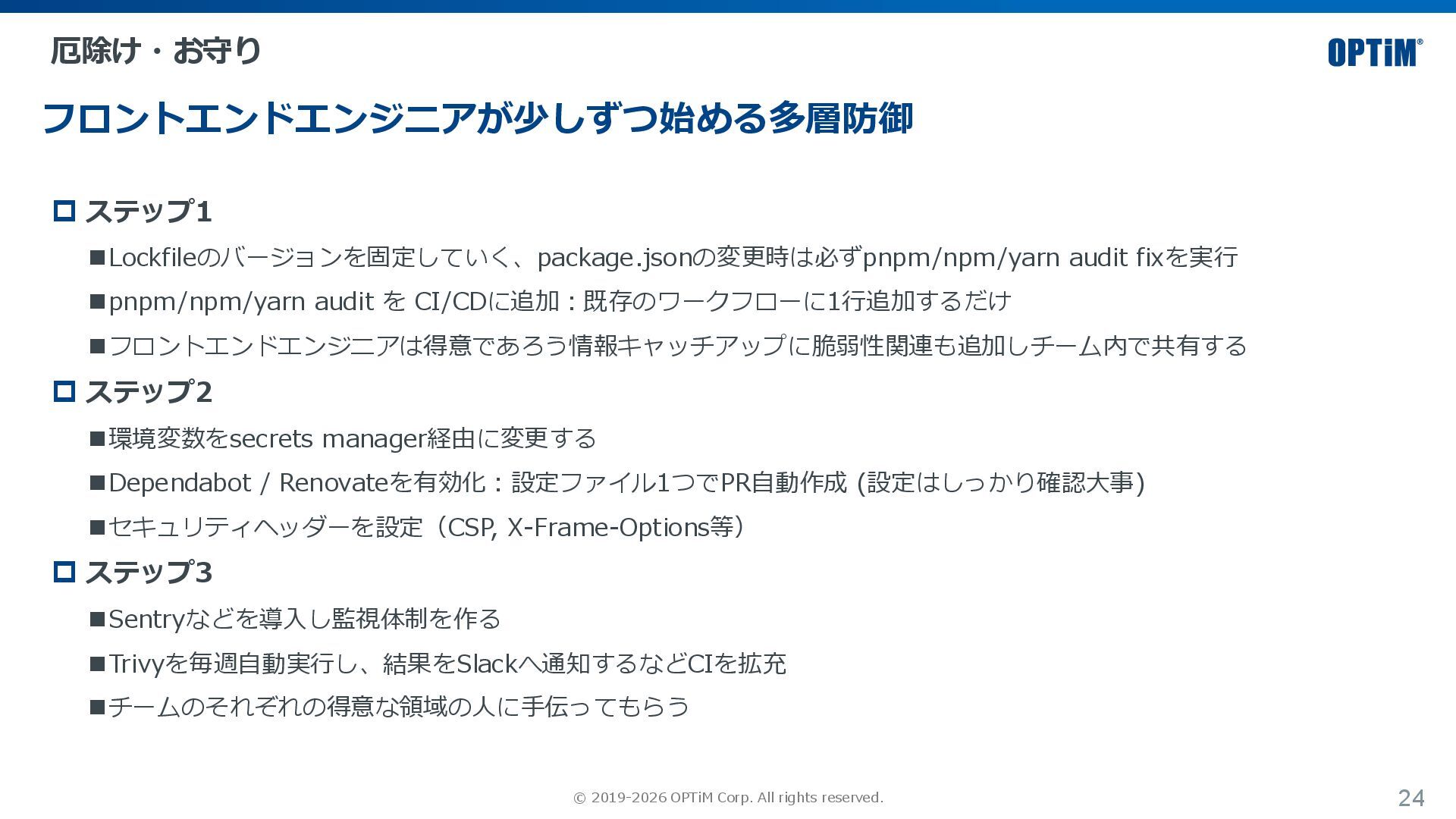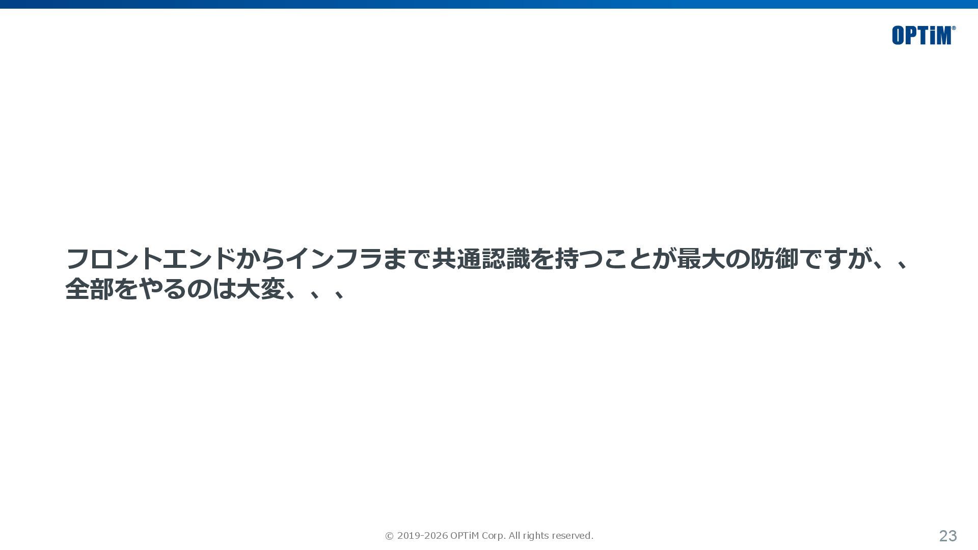 © 2019-2026 OPTiM Corp. All rights reserved. 23 フロントエンドからインフラまで共通認識を持つことが最大の防御ですが、、 全部をやるのは大変、、、