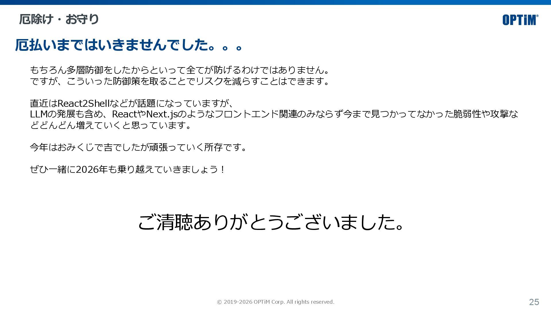 もちろん多層防御をしたからといって全てが防げるわけではありません。 ですが、こういった防御策を取ることでリスクを減らすことはできます。 直近はReact2Shellなどが話題になっていますが、 LLMの発展も含め、ReactやNext.jsのようなフロントエンド関連のみならず今まで見つかってなかった脆弱性や攻撃な どどんどん増えていくと思っています。 今年はおみくじで吉でしたが頑張っていく所存です。 ぜひ一緒に2026年も乗り越えていきましょう! ご清聴ありがとうございました。