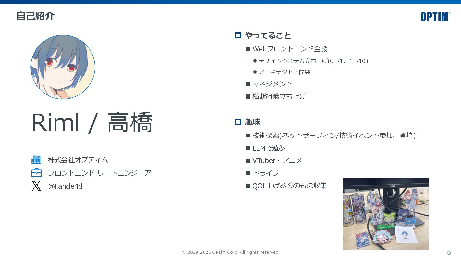 リードエンジニア Riml / 高橋 株式会社オプティム @Fande4d やってること ◼ Webフロントエンド全般 ⚫ デザインシステム立ち上げ(0→1、1→10) ⚫ アーキテクト・開発 ◼ マネジメント ◼ 横断組織立ち上げ 趣味 ◼ 技術探索(ネットサーフィン/技術イベント参加、登壇) ◼ LLMで遊ぶ ◼ VTuber・アニメ ◼ ドライブ ◼ QOL上げる系のもの収集