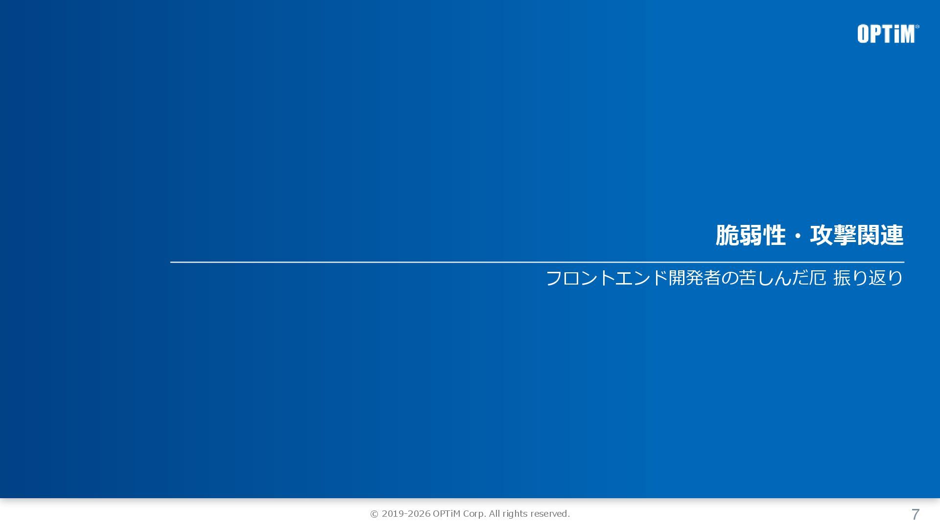 © 2019-2026 OPTiM Corp. All rights reserved. 7 脆弱性・攻撃関連 フロントエンド開発者の苦しんだ厄