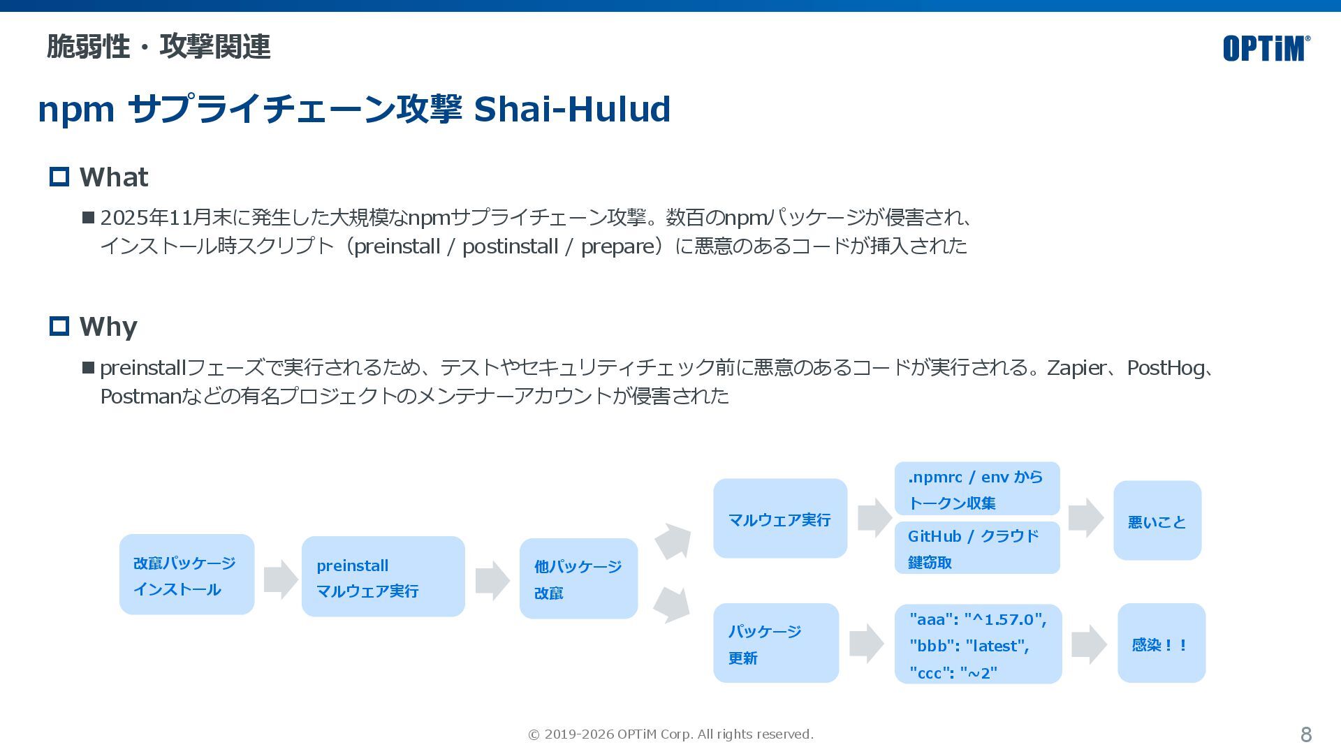 © 2019-2026 OPTiM Corp. All rights reserved. 8 脆弱性・攻撃関連 npm