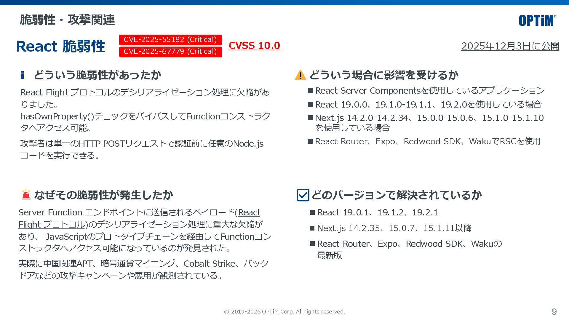 © 2019-2026 OPTiM Corp. All rights reserved. 9 脆弱性・攻撃関連 React
